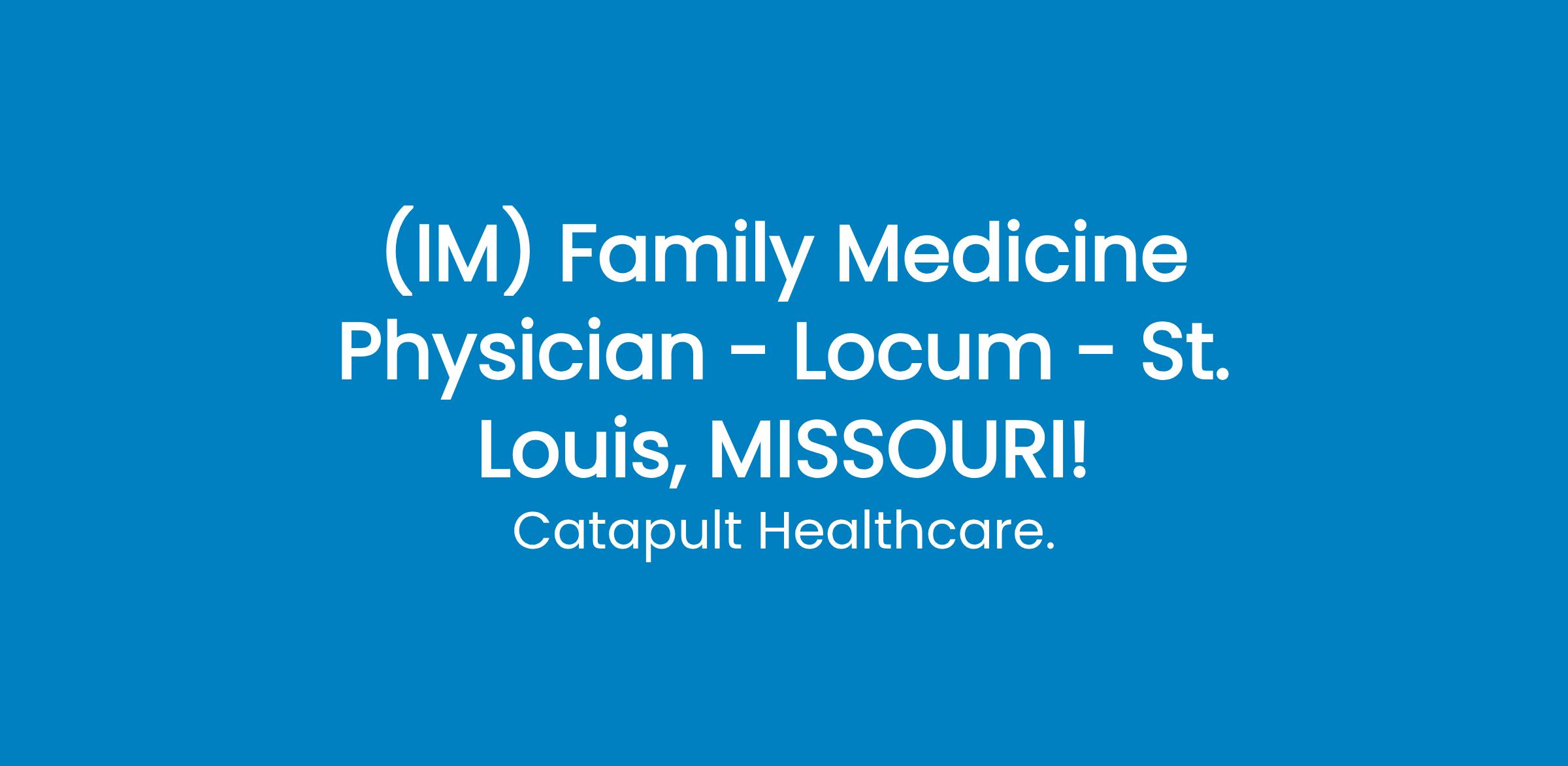 IM PHYSICIANSt. Louis (MO) Locum Assignment Interested providers should move fast-genuine care first environment! COMPETITIVE HOURLY RATE UNIQUE, GENUINE CARE FIRST APPROACH! You wont be scored on the number of referrals sent out - its actually just the opposite. You'll focus your time and attention on your patients, seeing an average of 2.5 appointments per hour; you're afforded the necessary time to evaluate, educate, coach, treat and document. 20-40 Hours a Week Treat children 2+ Primary Care - No Walk Ins, No Weekends, No On-Call Two MA's per provider ASAP Start! REQUIRED Must have current MO licence-or ability to obtain Board Certified/Eligible Apply now! Or contact Danny Carlton at CATAPULT HEALTHCARE ASAP for more information