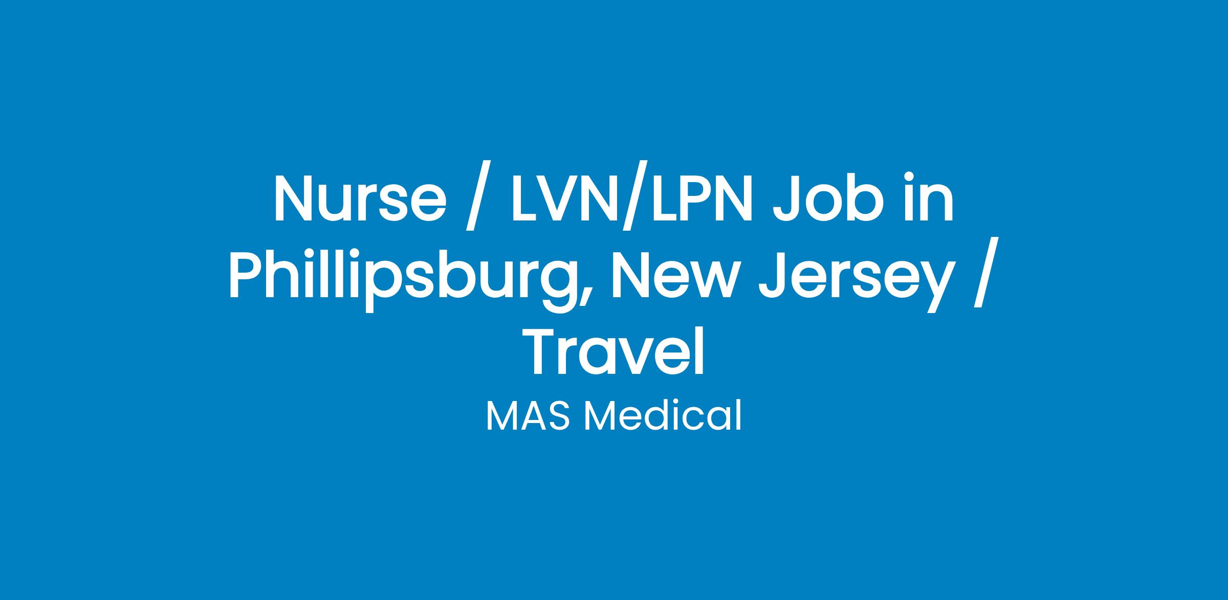 Licensed Practical Nurse(LPN) / TravelLicensed Practical Nurse - Travel - NJAt MAS Medical Staffing, our employees enjoy industry leading compensation packages and benefits, including:Competive weekly payGenerous housing stipends and housing assistance 401K ask for more details Health & Life Insurance coverage Travel reimbursement Licensure assistance & reimbursement Referral Bonus Program MAS Rewards Me Bonus Program Recruiters on call 24/7 via text, email, or phone. If you are looking for a staffing agency that has your best interest at heart and a recruiter that will work 1 on 1 with you to find the best assignment available, please reach out to us today!