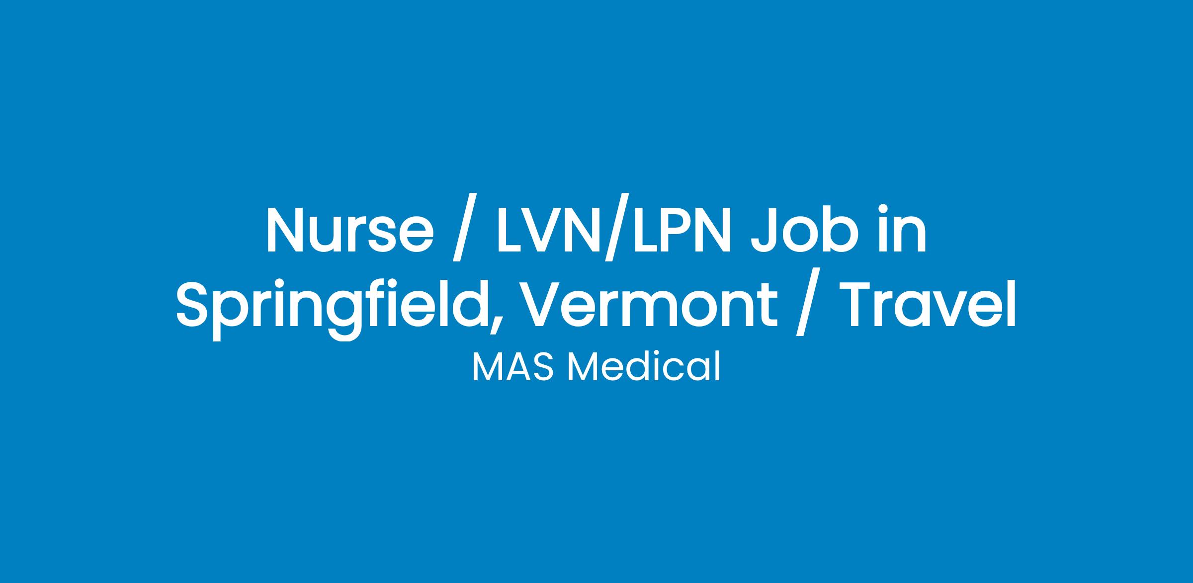 Licensed Practical Nurse(LPN) / TravelLicensed Practical Nurse - Travel - VTAt MAS Medical Staffing, our employees enjoy industry leading compensation packages and benefits, including:Competive weekly payGenerous housing stipends and housing assistance 401K ask for more details Health & Life Insurance coverage Travel reimbursement Licensure assistance & reimbursement Referral Bonus Program MAS Rewards Me Bonus Program Recruiters on call 24/7 via text, email, or phone. If you are looking for a staffing agency that has your best interest at heart and a recruiter that will work 1 on 1 with you to find the best assignment available, please reach out to us today!