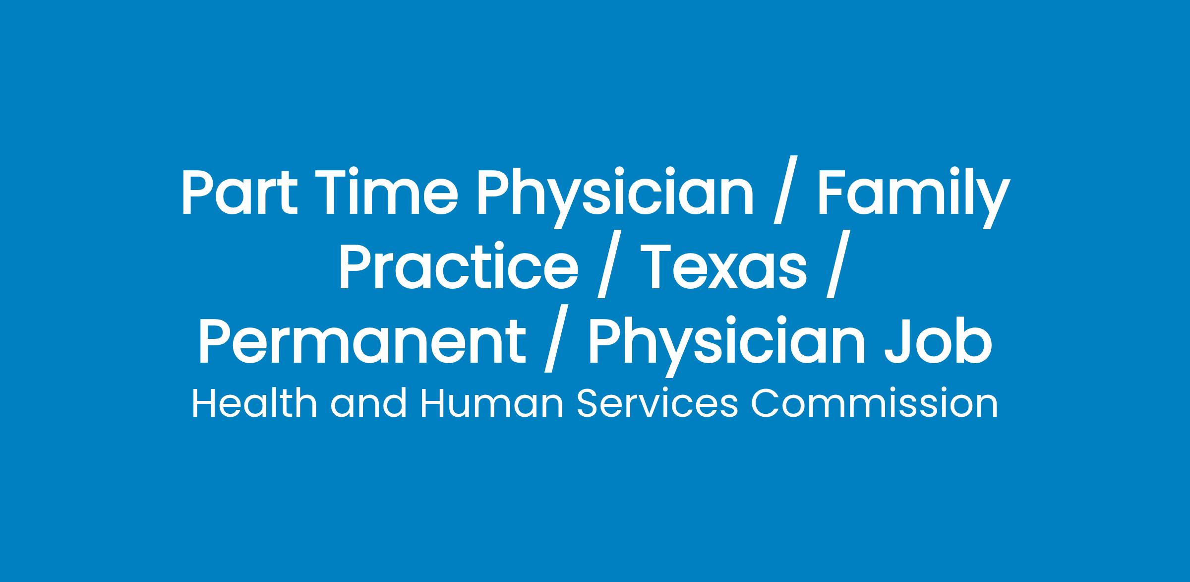 PART TIME Job Description:Physician I-PARTIME The El Paso State Supported Living Center (SSLC) is seeking a Physician to join an interdisciplinary team of professionals to provide clinical care to residents of the SSLC. As a State Supported Living Physician, you will work at the SSLC campus with a dynamic group of staff and professionals who are dedicated to providing supports and services for individuals with intellectual and developmental disabilities. This is a team environment where staff clinicians collaborate to provide comprehensive care and services. To learn more about the SSLCs, see The State of Texas offers many benefits to employees, including competitive salaries, career advancement, health and dental insurance, and paid vacation and sick leave. The Staff Physician at the State Supported Living Center (SSLC) is responsible for the effective delivery of high quality medical services to individuals with intellectual disabilities served by HHSC State Supported Living Centers. Work involves direct delivery of clinical practices and monitoring of medical services, participating in treatment team process, advocating for the medical needs of individuals served, and working with the individuals families, Family Nurse Practitioners, Physician Assistant(s) and with consultants and community medical providers in other medical specialty areas. This position reports directly to the Medical Director of the State Supported Living Center and works under limited supervision with considerable latitude for the use of initiative and independent judgment. Provides treatment to HHS employees injured in course and scope of employment.