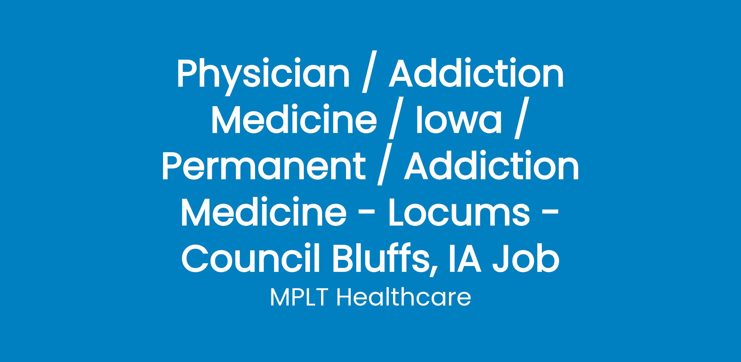 MPLT Healthcare is looking for physicians who Understand the Urgency, Never Give Up, and Have the Courage to Excel in the forever changing medical industry! We have numerous opportunities for an experienced Addiction Medicine Physician w ith highly competitive pay rates in Council Bluffs, IA.