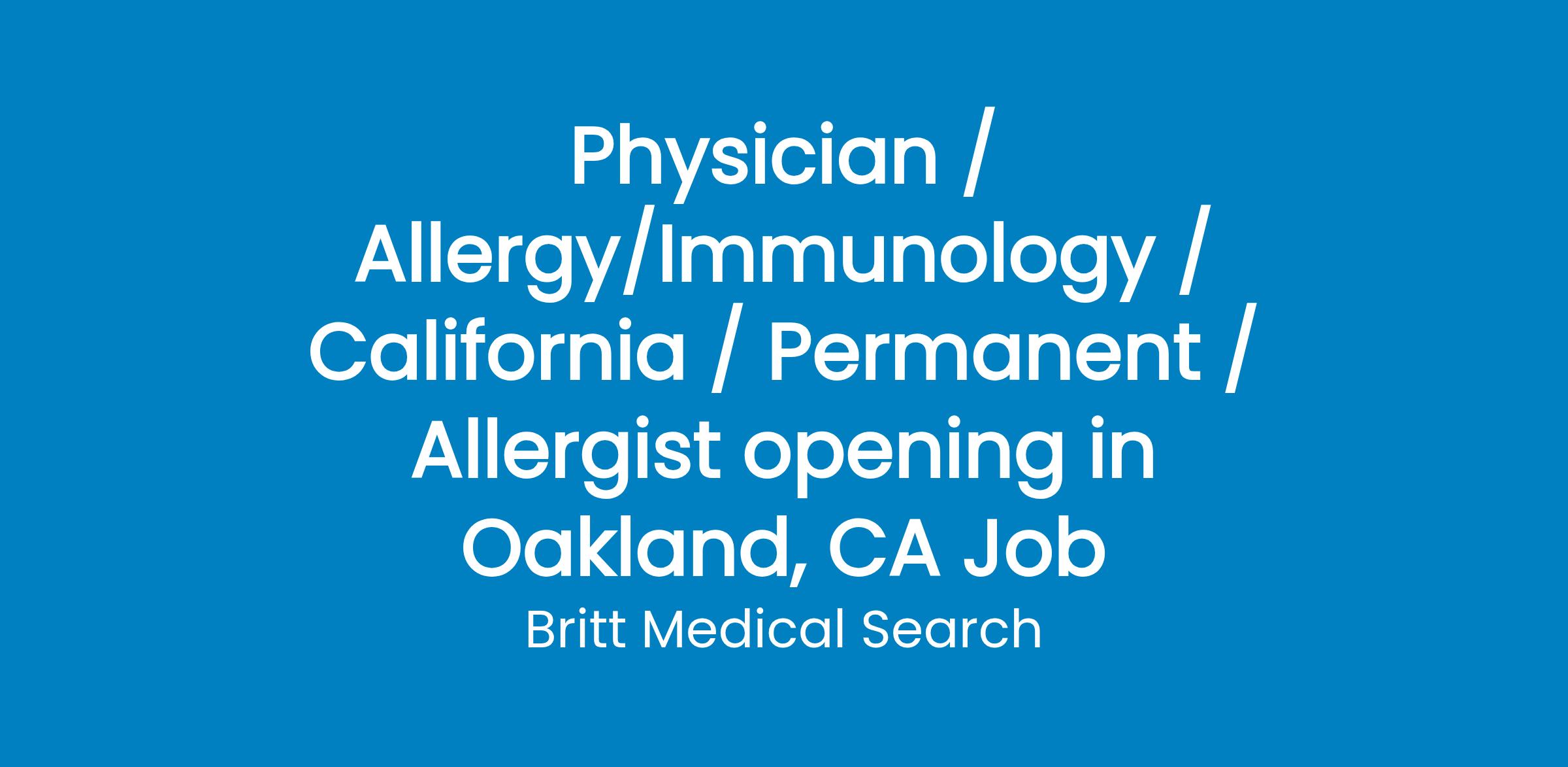 Physician / Allergy/Immunology / California / Permanent / Allergist opening in Oakland, CA Job