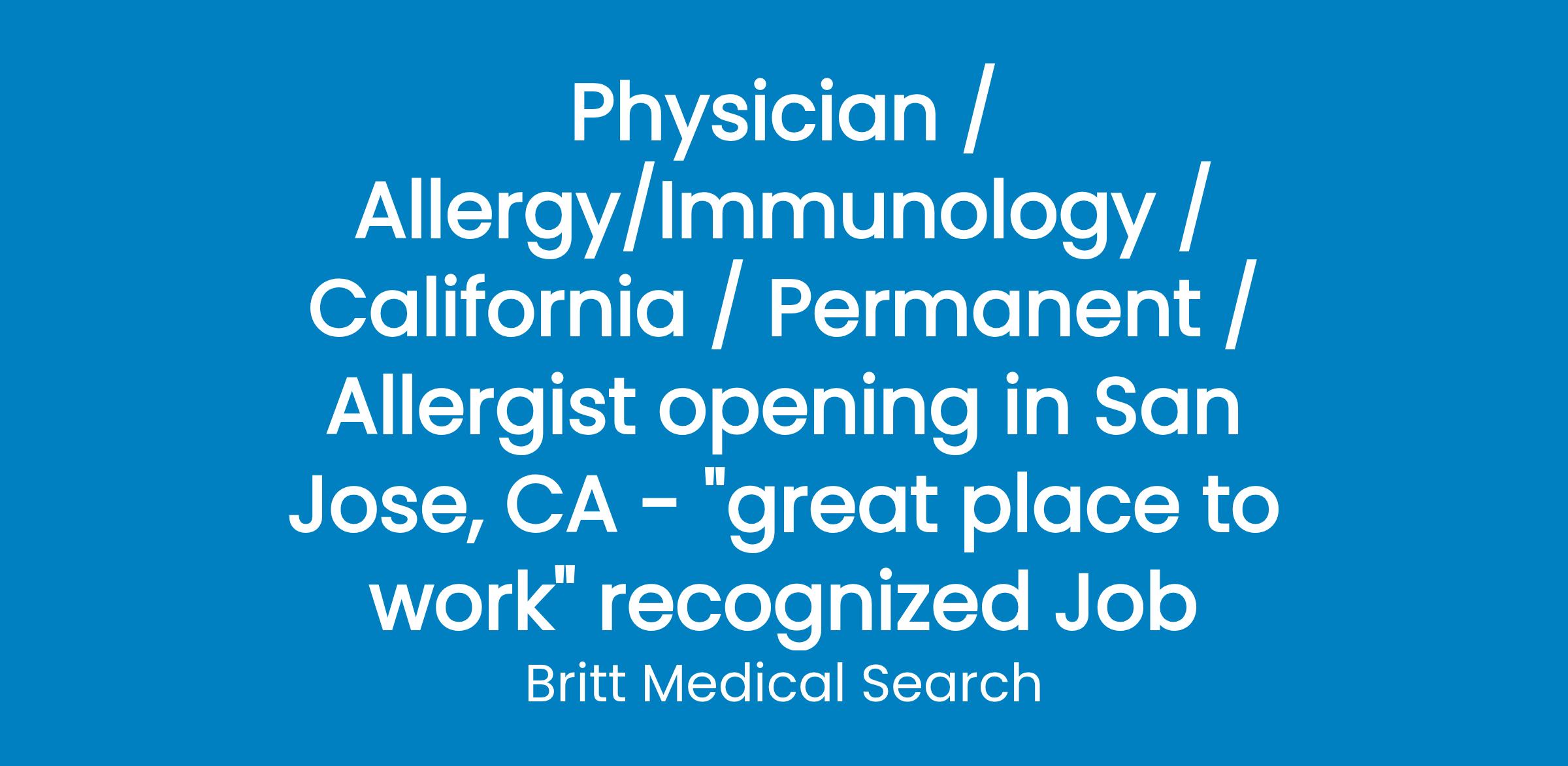 Physician / Allergy/Immunology / California / Permanent / Allergist opening in San Jose, CA - "great place to work" recognized Job