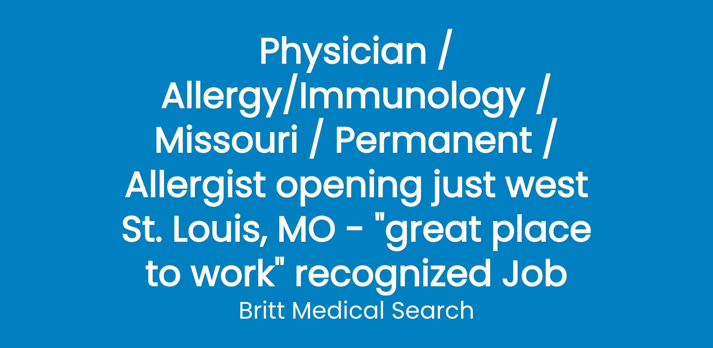 Physician / Allergy/Immunology / Missouri / Permanent / Allergist opening just west St. Louis, MO - "great place to work" recognized Job