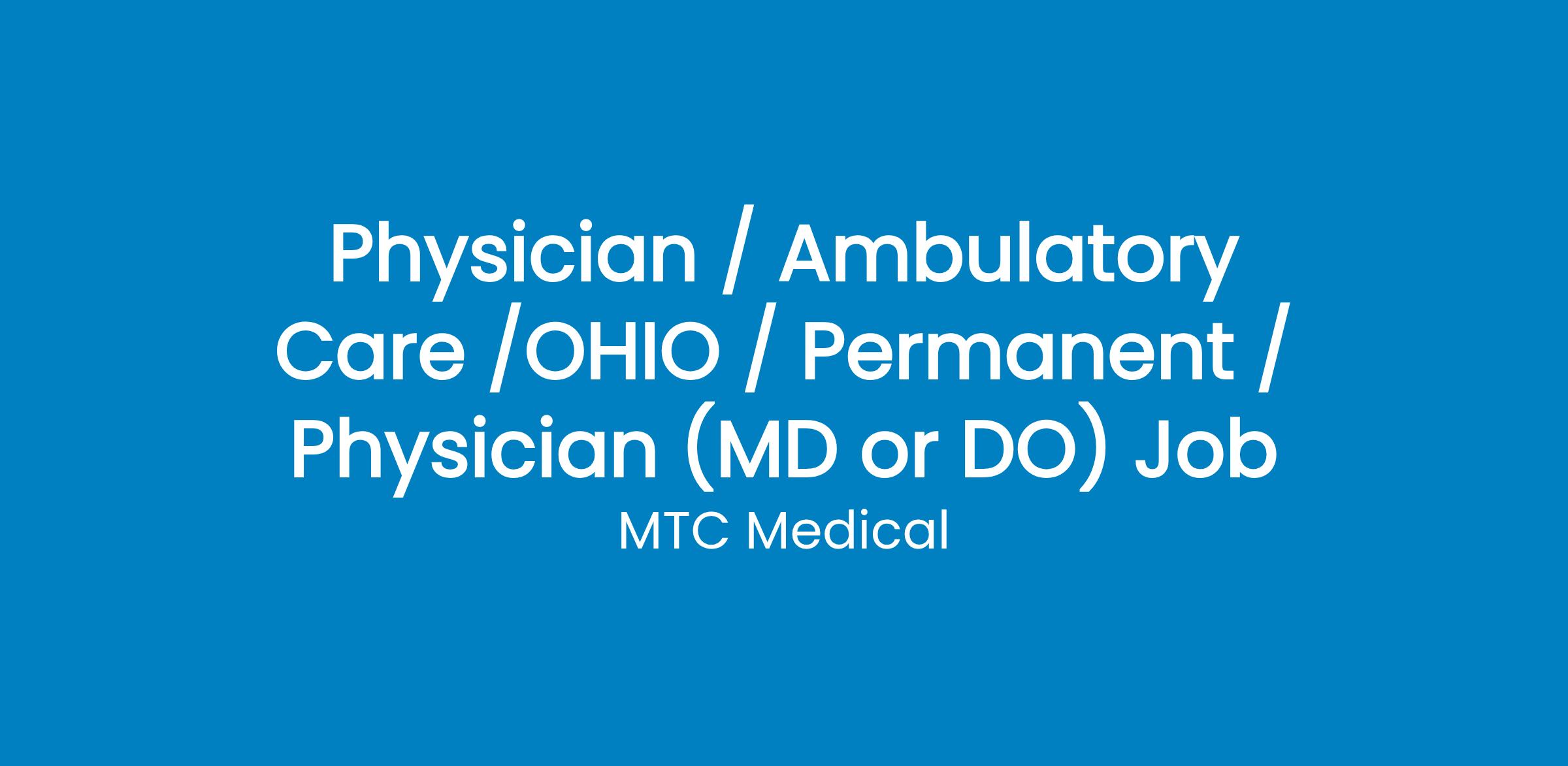 MTC Medical is seeking a full-time Physician for our facility in Marion, OH. In this ambulatory-like setting, you will see a wide-variety of cases that you might not get a chance to see in a clinical setting and enjoy the freedom that not worrying about the "back end" of the business brings. Did we mention more compliant patients who are grateful to get care? We offer a safe, friendly environment where you can focus on practicing pure medicine.