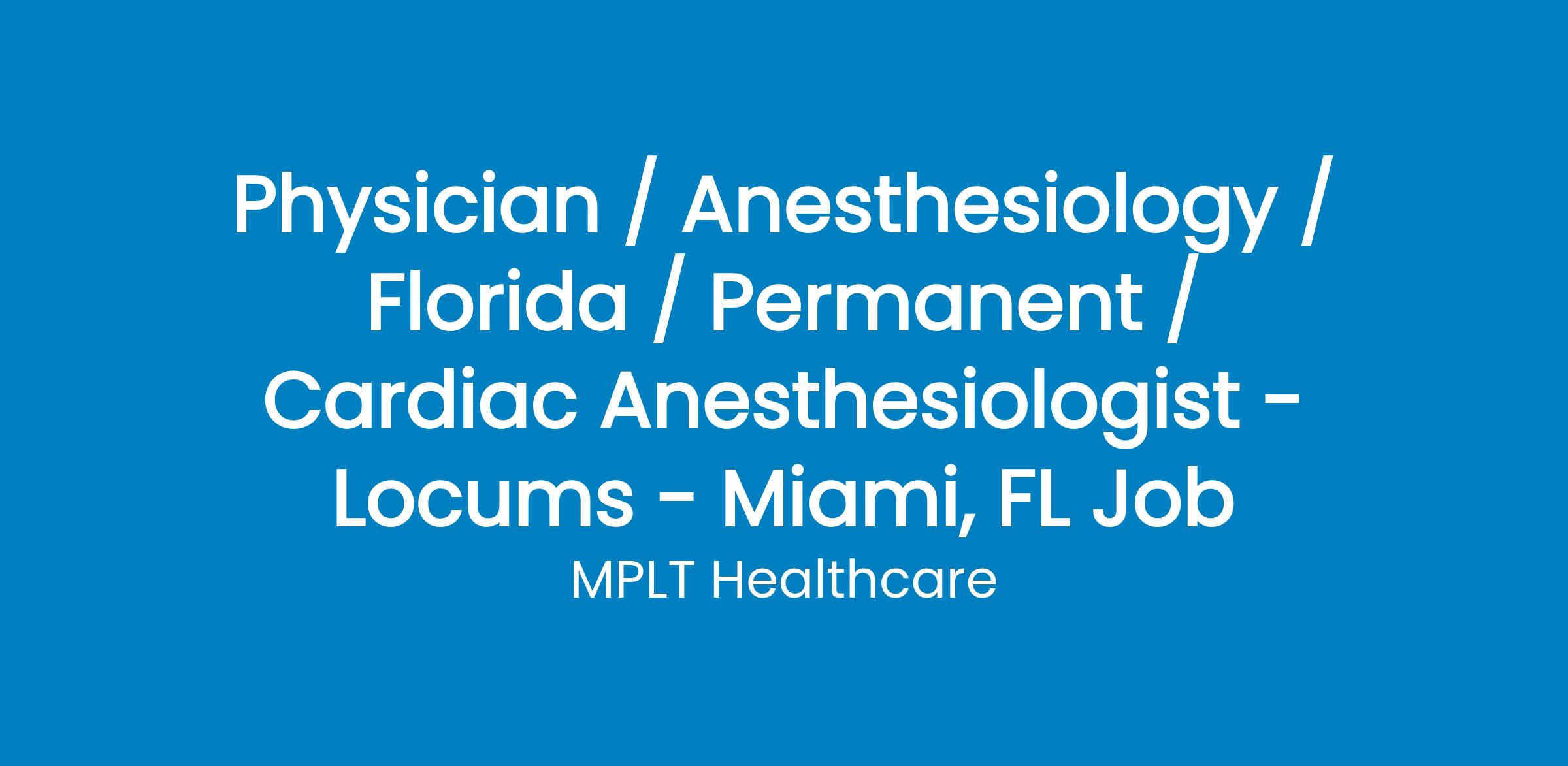 MPLT Healthcare is looking for Cardiac Anesthesiologist who Understand the Urgency, Never Give Up, and Have the Courage to Excel in the forever changing medical industry! We have numerous opportunities for an experienced Cardiac Anesthesiologist with highly competitive pay rates in Miami, FL.