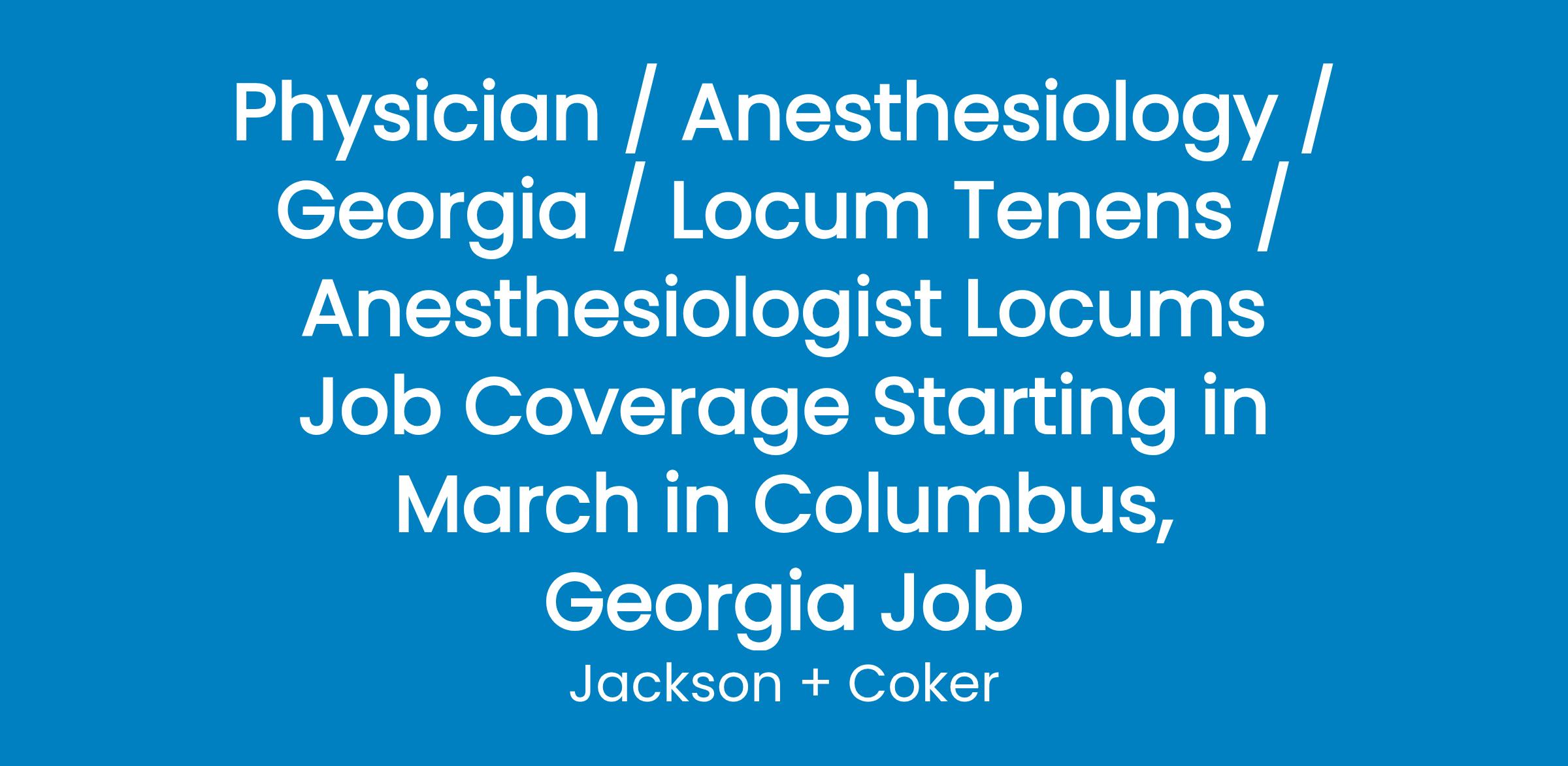 Anesthesiologist Locums Job Coverage Starting ASAP in Columbus, Georgia