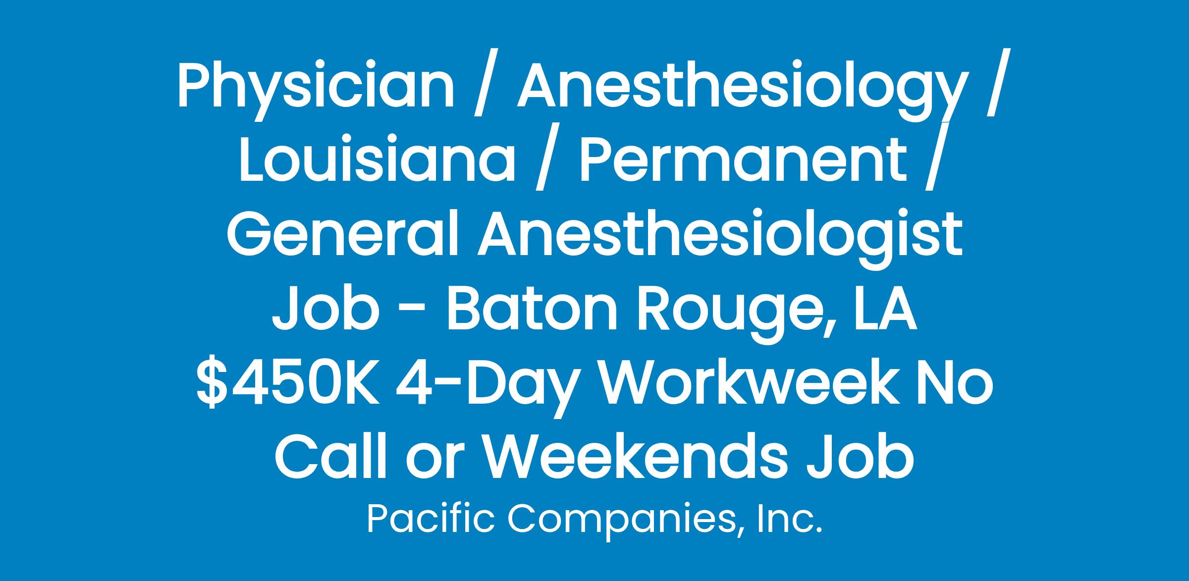 Join a thriving, physician-led anesthesia team at a state-of-the-art orthopedic surgery center in Baton Rouge, Louisiana. This is an exceptional opportunity for a General Anesthesiologist seeking a high-volume regional practice in a collegial, efficient environment-without sacrificing quality of life. Work a four-day schedule with no nights, weekends, or call, and enjoy full support from a strong team of CRNAs and administrators who value collaboration and clinical excellence. Physicians perform all pre-op evaluations and regional blocks, supervise CRNAs, and enjoy autonomy within a modern outpatient setting known for procedural efficiency and professional respect. If you're seeking stability, balance, and a place where leadership truly supports physicians, this position delivers on every front.
