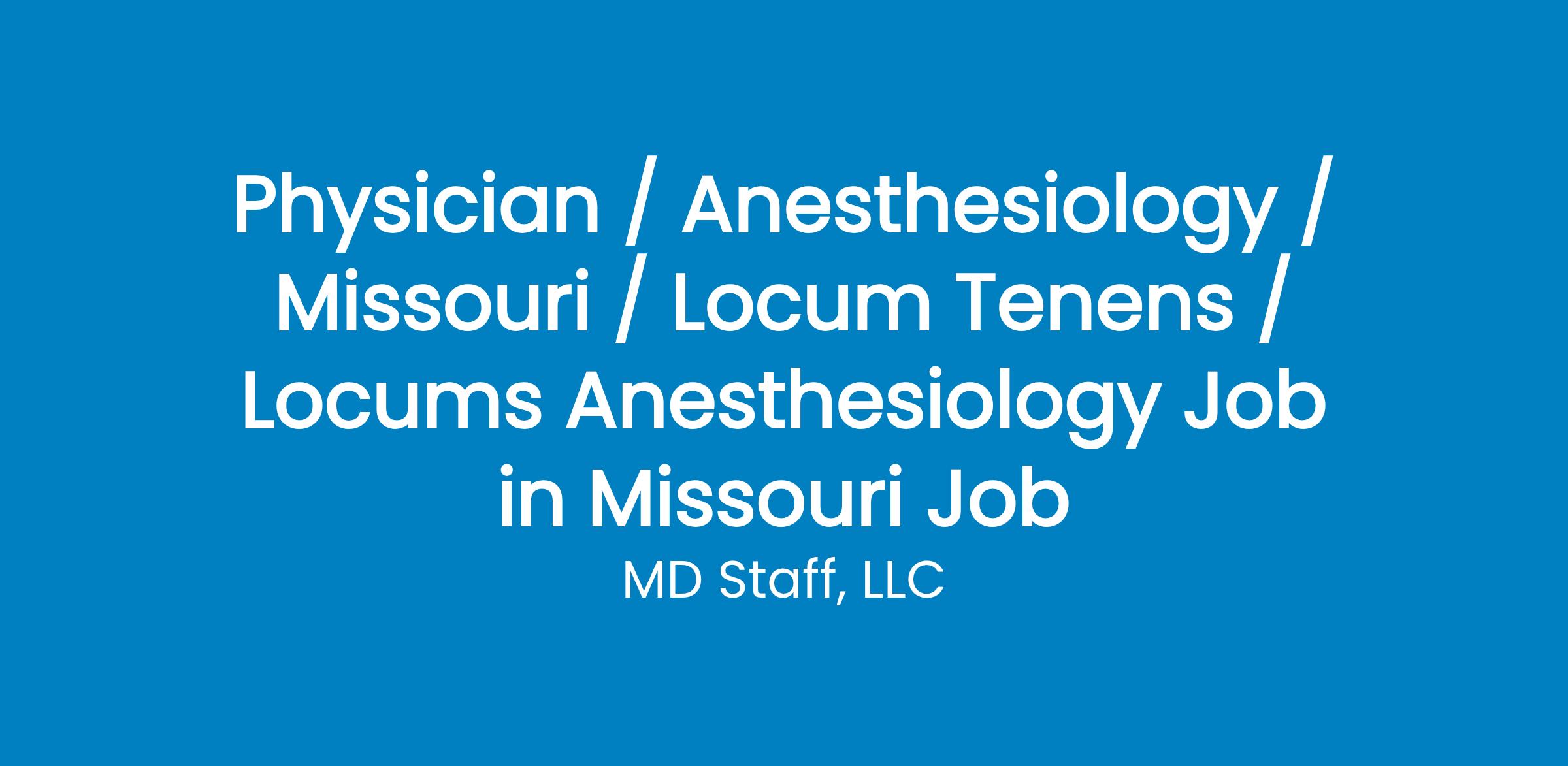 Physician - Anesthesiology - Locum Tenens Opportunity in Missouri Are you an experienced Anesthesiologist looking for a locum tenens assignment? We have a compelling opportunity in Missouri. Start Date: January 1, 2024 Duration: January 1, 2024 - August 31, 2024 Shift: Day 5x8-Hour (07:00 - 07:00) Located near KIDDER, MO Patient Volume/Cases: 451 bed hospital; 23-24 anesthetizing locations per day Patient Population/Age: 6 months - 90+ EMR: Cerner Certifications Required: Board Certified/Board Eligible Anesthesiologist Skills Required: Pre-op evaluation; General Anesthesia; Regional Anesthesia; MAC; Obstetric Anesthesia; Outpatient Pediatric Anesthesia Certifications Preferred: AHA ACLS and PALS MO License Required: Yes This is a fantastic opportunity to provide essential care to a diverse patient population. If you're interested, please call or text MD Staff at . You can also reach us via email at . Reference Job ID . Don't miss out on this chance to make a significant impact on the community!