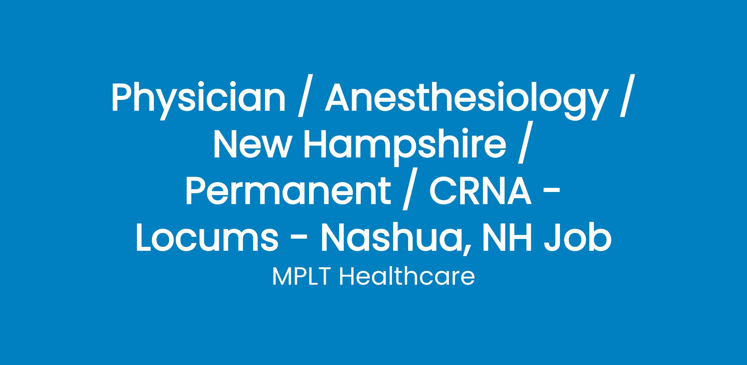 MPLT Healthcare is looking for a CRNA who Understand the Urgency, Never Give Up, and Have the Courage to Excel in the forever changing medical industry! We have numerous opportunities for an experienced CRNA with highly competitive pay rates in Nashua, NH.