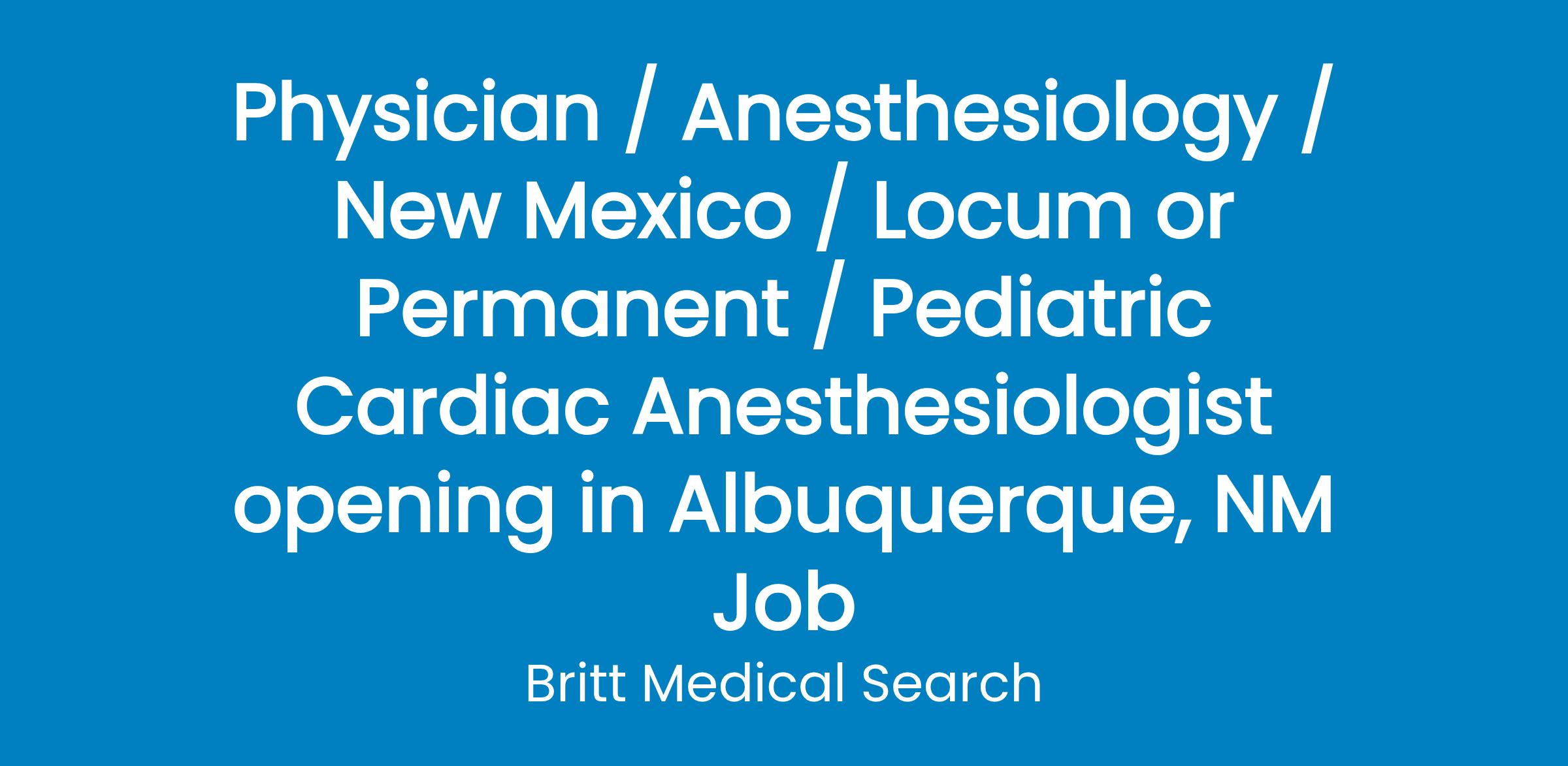 Seeking BE/BC Pediatric Cardiac Anesthesiology Physician to join growing team of exceptional clinicians and staff in Albuquerque, NM.