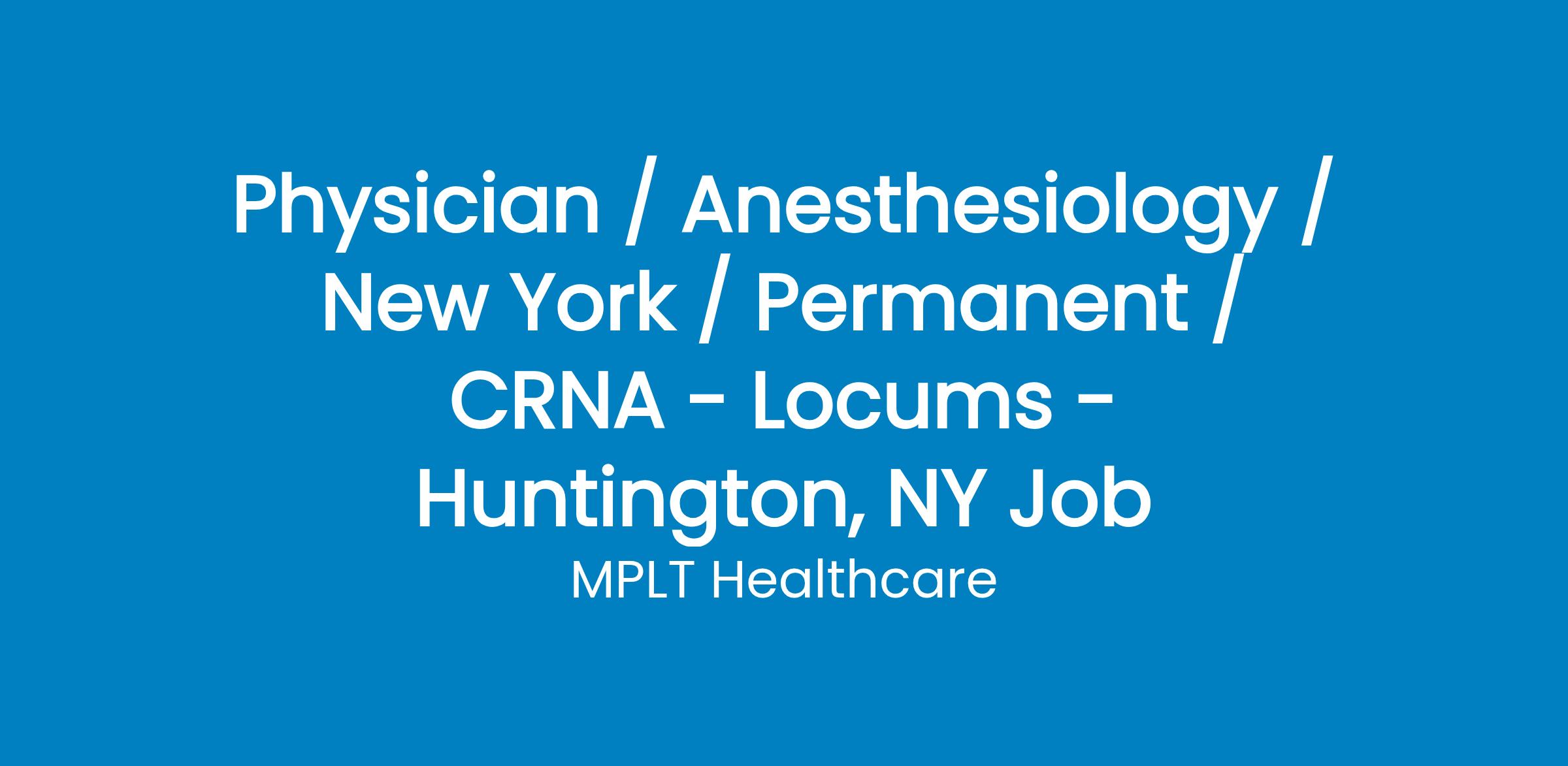 MPLT Healthcare is looking for a CRNA who Understand the Urgency, Never Give Up, and Have the Courage to Excel in the forever changing medical industry! We have numerous opportunities for an experienced CRNA with highly competitive pay rates in Huntington, NY