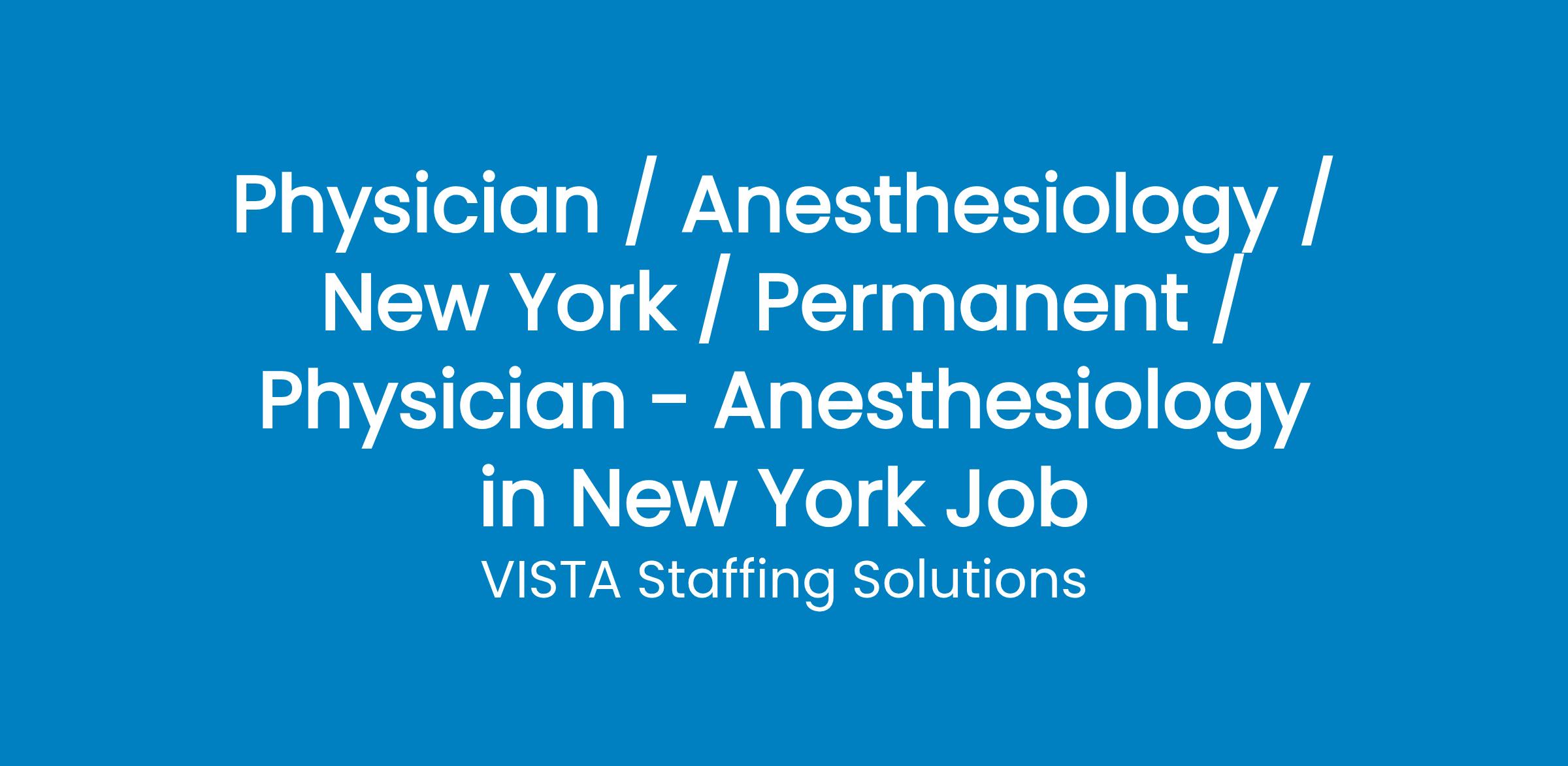Are you anAnesthesiology Physiciansearching for your next exciting locum tenens opportunity? This position with one of VISTA s healthcare partners inNew Yorkmight just be the opportunity for you!