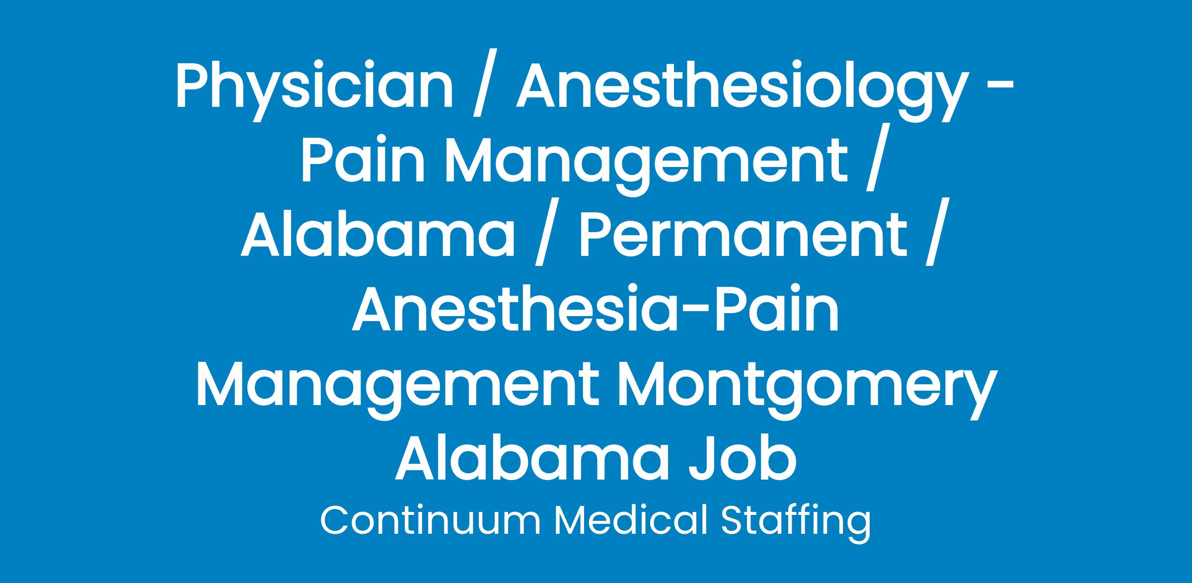 INTERVENTIONAL PAIN MANAGEMT MONTGOMERY ALABAMA We are looking for a BC/BE Pain Management Physician for Montgomery Alabama. May have done residency in either PM&R or Anesthesia or Neurology or Family Medicine with a fellowship in Interventional Pain Base comp will vary based on experience, candidate capability, etc. would be start at 400 to 435k Ability to buy into local Ambulatory Surgery Center There will be ASC ownership opportunities for both sites. We run very profitable Ambulatory Surgery Centers and distributions can be very significant.Full benefits included Contact