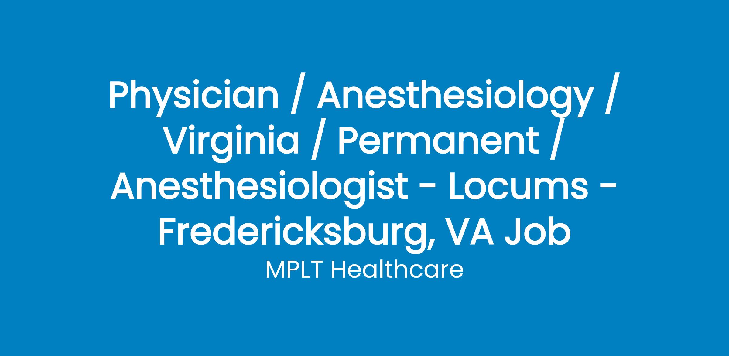 MPLT Healthcare is looking for a physician who Understand the Urgency, Never Give Up, and Have the Courage to Excel in the forever changing medical industry! We have numerous opportunities for an experienced Anesthesiology with highly competitive pay rates in Fredericksburg, VA .