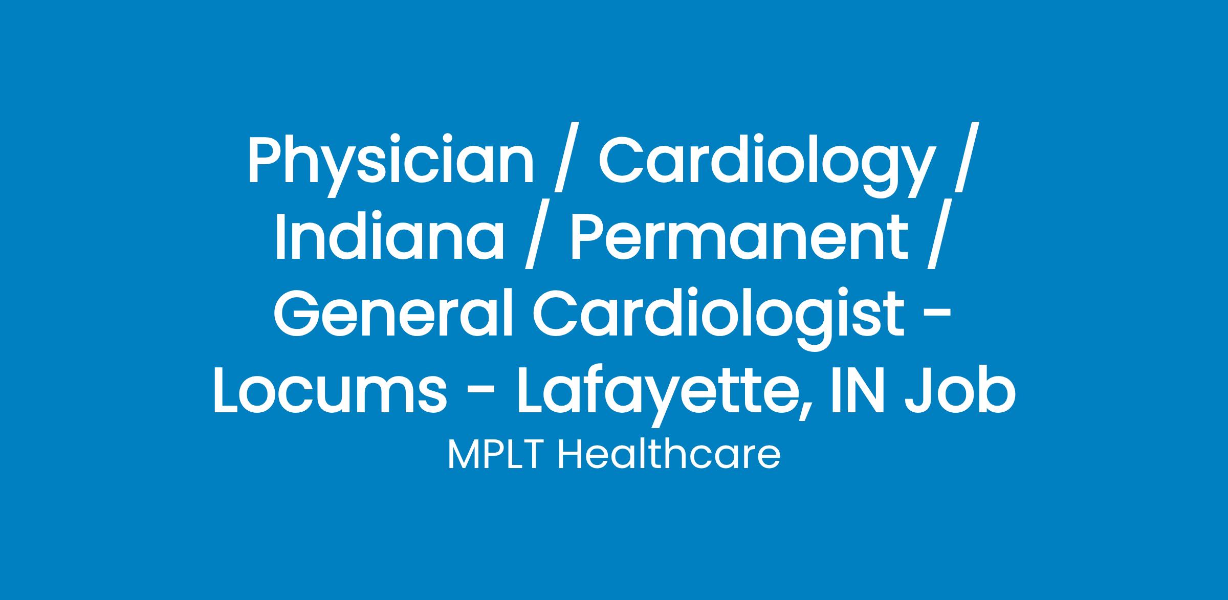 MPLT Healthcare is looking for physician s who Understand the Urgency, Never Give Up, and Have the Courage to Excel in the forever changing medical industry! We have numerous opportunities for an experienced General Cardiologist with highly competitive pay rates in Lafayette, IN.