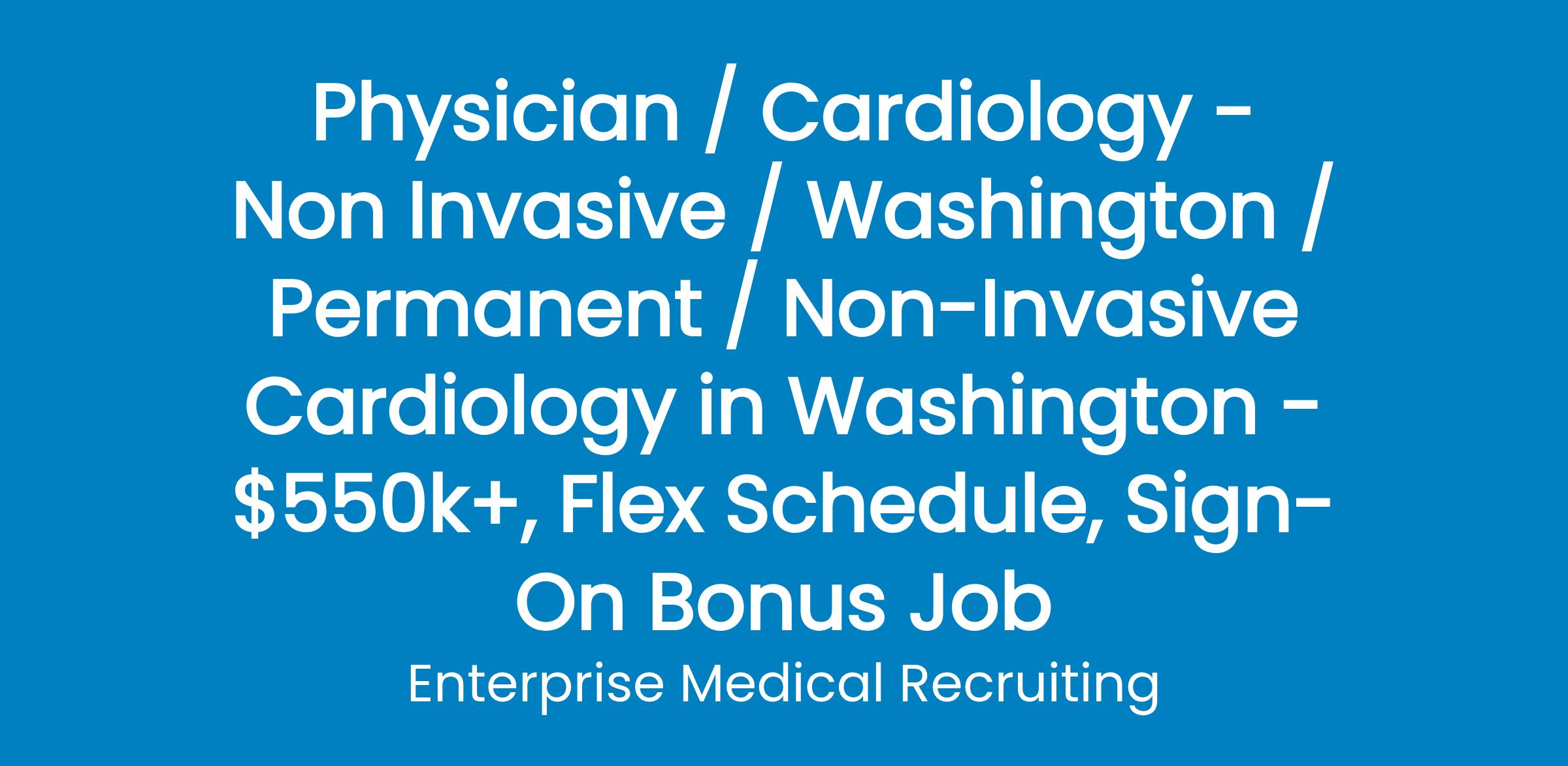 The Heart and Vascular program in Washington State is seeking a Non-Invasive Cardiologist to join a team of 11 cardiologists and 8 NP/PAs.Comprehensive state-of-the-art cardiac care including interventional, electrophysiology, imaging services, CT surgery, vascular surgery, and a structural heart program.