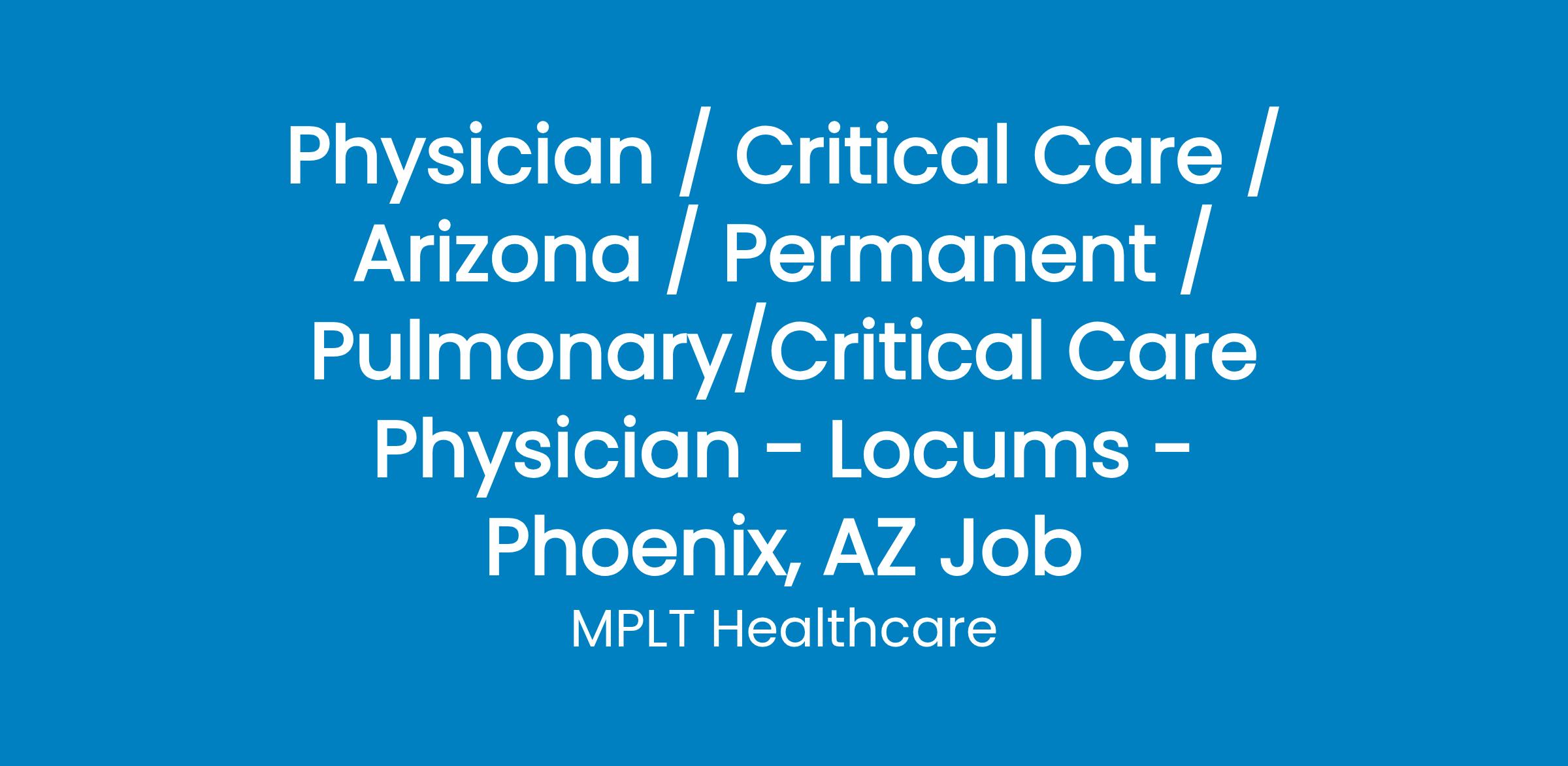 MPLT Healthcare is looking for physicians who Understand the Urgency, Never Give Up, and Have the Courage to Excel in the forever changing medical industry! We have numerous opportunities for an experienced Pulmonary/Critical Care Physician with highly competitive pay rates in Phoenix, AZ .
