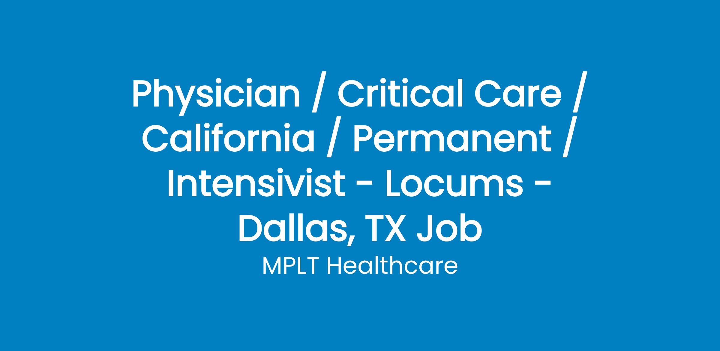 MPLT Healthcare is looking for physicians who Understand the Urgency, Never Give Up, and Have the Courage to Excel in the forever changing medical industry! We have numerous opportunities for an experienced Intensivist with highly competitive pay rates in Dallas, TX.