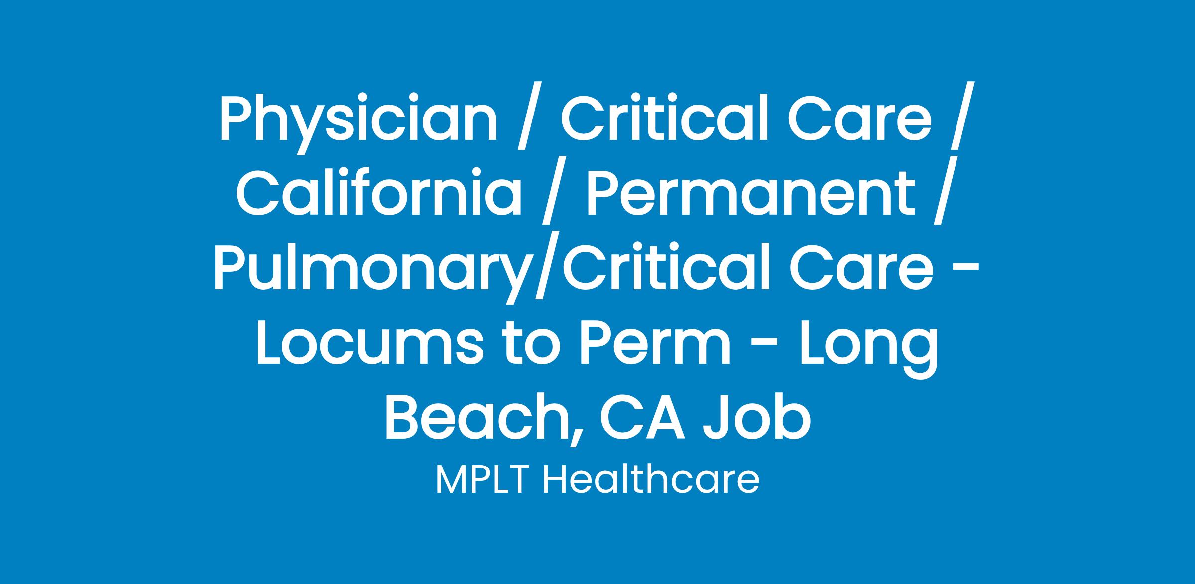 MPLT Healthcare is looking for physicians who Understand the Urgency, Never Give Up, and Have the Courage to Excel in the forever changing medical industry! We have numerous opportunities for an experienced Pulmonologist/Critical Care Physician with highly competitive pay rates in Long Beach, CA.
