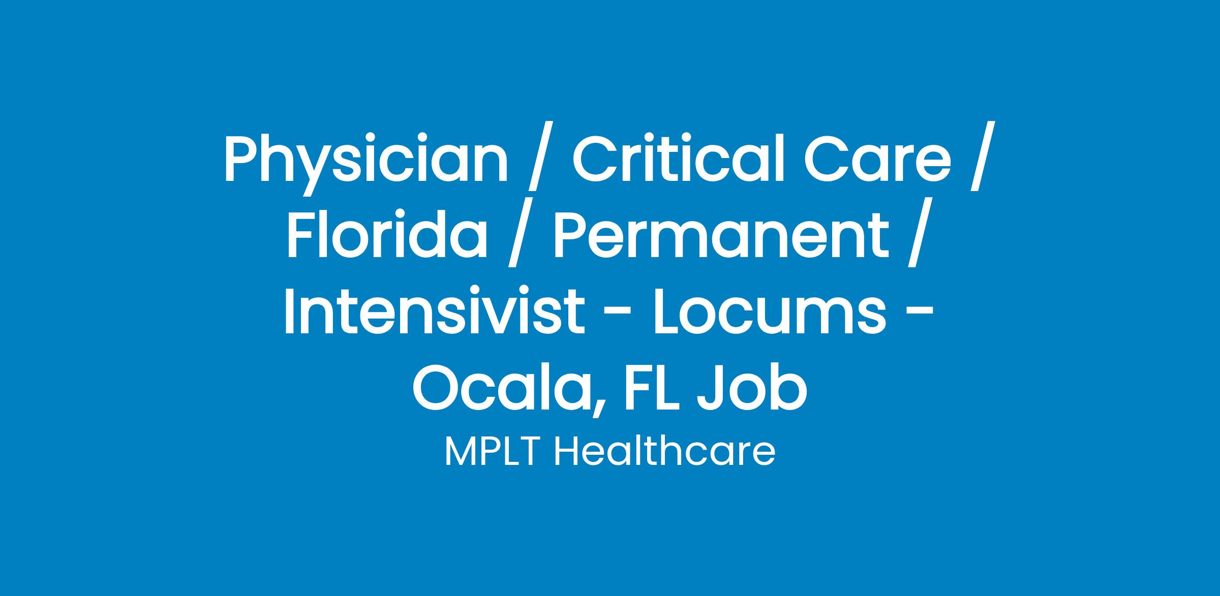 MPLT Healthcare is looking for physicians who Understand the Urgency, Never Give Up, and Have the Courage to Excel in the forever changing medical industry! We have numerous opportunities for an experienced Intensivist with highly competitive pay rates in Ocala, FL.