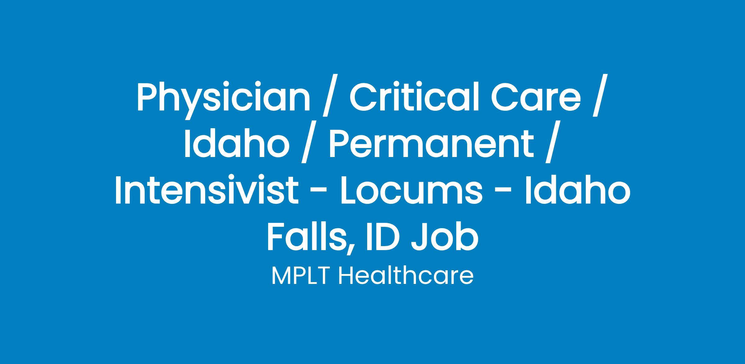 MPLT Healthcare is looking for physicians who Understand the Urgency, Never Give Up, and Have the Courage to Excel in the forever changing medical industry! We have numerous opportunities for an experienced Intensivist with highly competitive pay rates in Idaho Falls, ID.