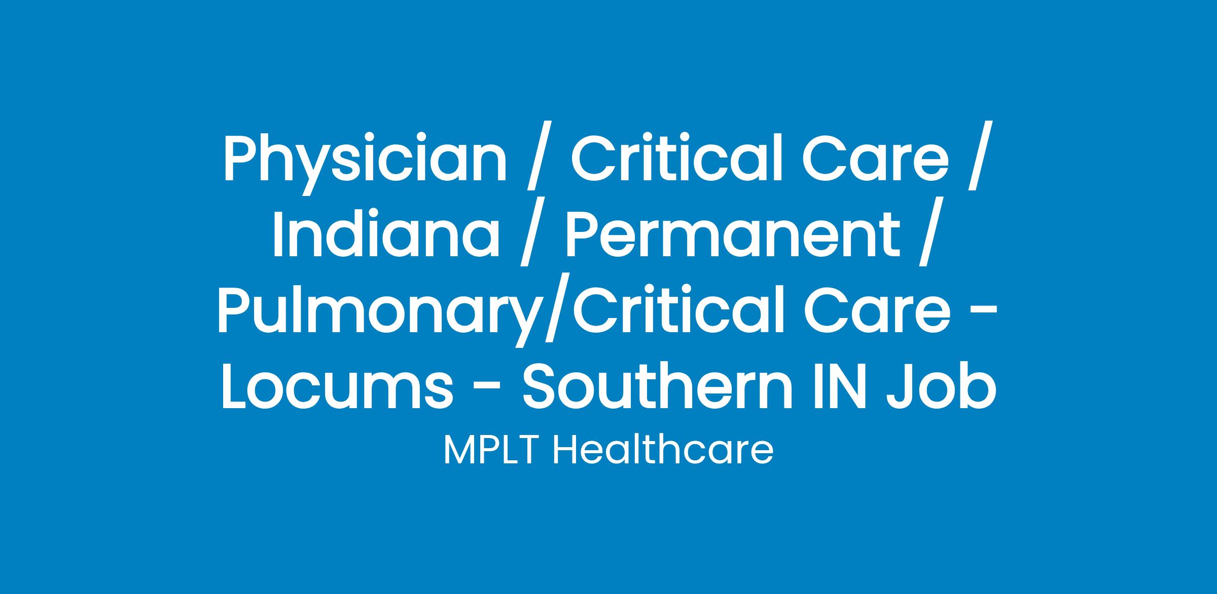 MPLT Healthcare is looking for physicians who Understand the Urgency, Never Give Up, and Have the Courage to Excel in the forever changing medical industry! We have numerous opportunities for an experienced Pulmonary/Critical Care Physician with highly competitive pay rates in Southern Indiana .