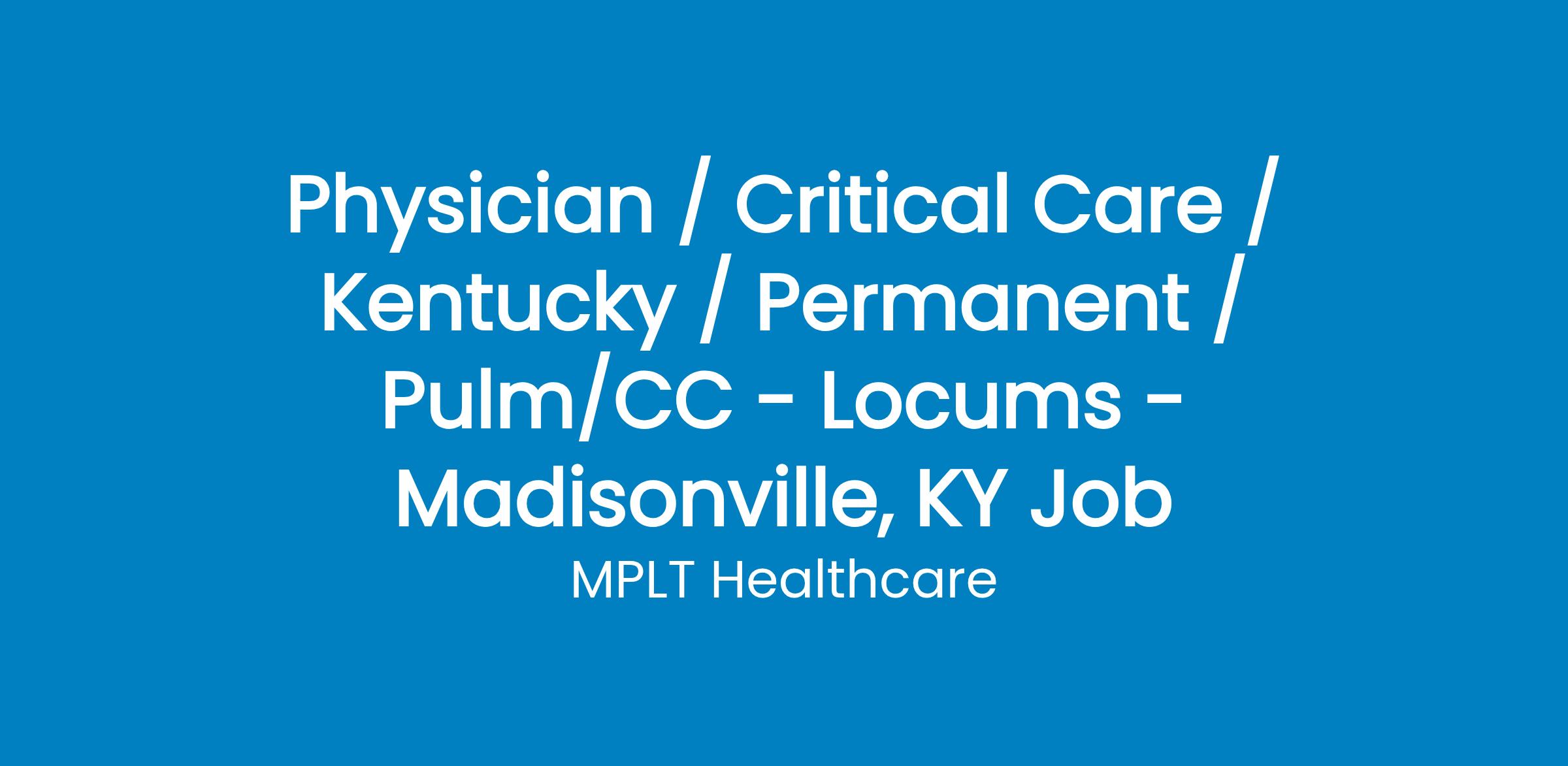 MPLT Healthcare is looking for physicians who Understand the Urgency, Never Give Up, and Have the Courage to Excel in the forever changing medical industry! We have numerous opportunities for an experienced Pulmonary/Critical Care Physician w ith highly competitive pay rates in Madisonville, Kentucky.