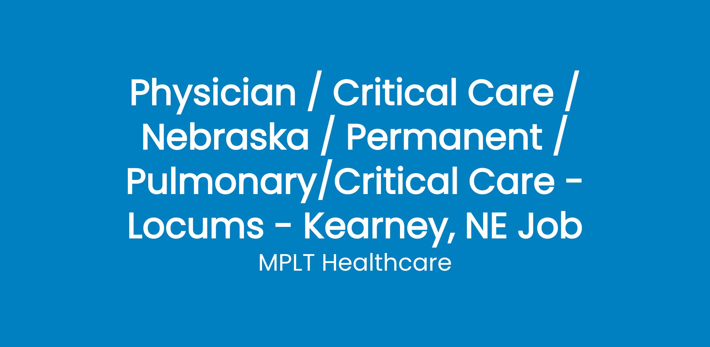 MPLT Healthcare is looking for physicians who Understand the Urgency, Never Give Up, and Have the Courage to Excel in the forever changing medical industry! We have numerous opportunities for an experienced Pulmonary/Critical Care Physician with highly competitive pay rates in Kearney, NE.