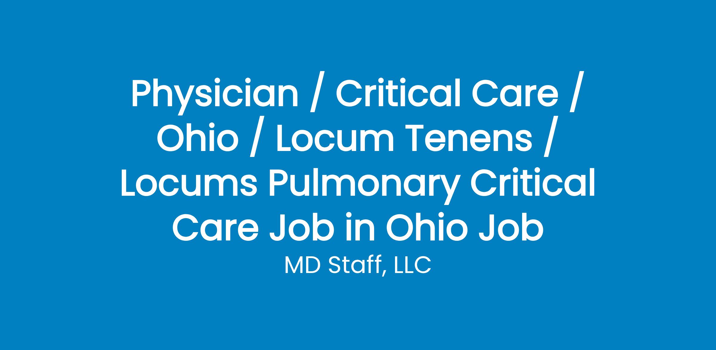 Locum Opportunity: Pulmonary Critical Care Physician Are you a Pulmonary Critical Care Physician looking for locum coverage? We have a fantastic opportunity in Ohio! Job Details: Specialty: Pulmonary Critical Care Start Date: November 2023 - July 2024 Schedule: Saturday 7:00 AM - Monday 7:00 AM (1-2 weekends/month) Average ICU Patients Per Day: 16-20 Average Inpatient (non ICU) Patients per Physician per Day: 20 Average Admissions per Physician per Day: 6-8 Number of ICU Beds: 20 EMR: EPIC Location: Near Defiance, OH Requirements: Pulmonary Critical Care Board Certified (REQUIRED) BLS/ACLS/Conscious Sedation Certified (REQUIRED) Active OH license & DEA (Preferred, willing to review providers needing) Flu shot (Required) COVID Vaccine (Highly preferred) This is an excellent opportunity to contribute to compassionate, high-quality health care in Ohio. If you are interested, please call or text MD Staff at . You can also reach us via email at . Please reference Job ID # j-174176.