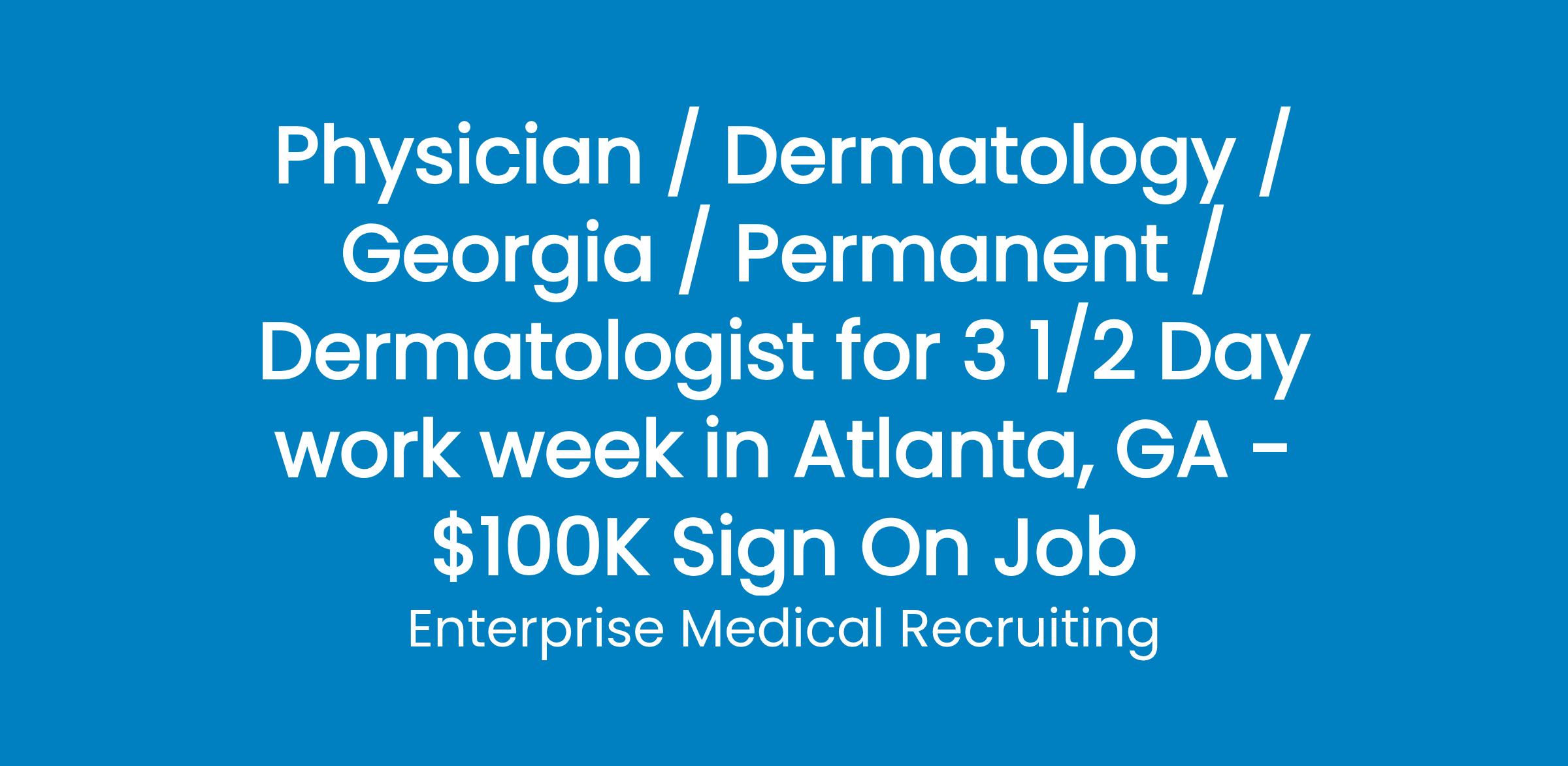 Join 3 board-certified dermatologists for a 3 1/2 day work week doing General Dermatology in Atlanta, Georgia. The group offers the latest innovations in Dermatology and educates their patients while providing accurate and complete treatment plans.