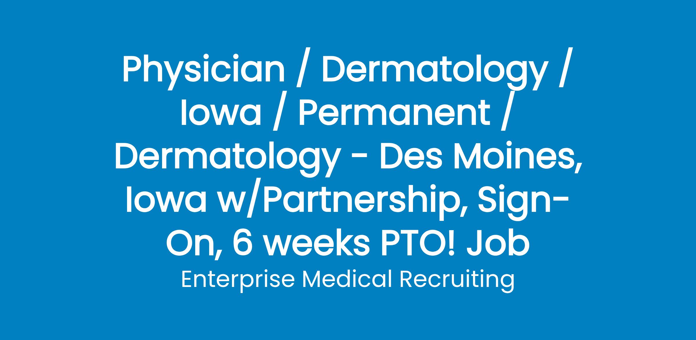 A large private group in Des Moines, IA,is adding a Dermatologistto its practice. Enjoy a collegial physician community, an excellent payor mix, and an in-house referral base.