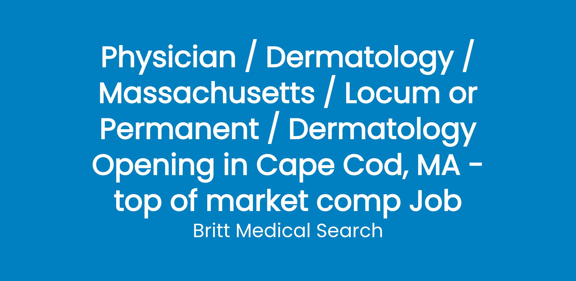 Cape Cod, MA practices seeking BE/BC Dermatologist to join their team. The practice is a full-service general dermatology, surgical, and cosmetics practice. You will be working alongside 1 dermatologist, and 1 advanced practitioner. You will be supported by an experienced administrative and clinical team that scribe and perform clinical administrative tasks freeing you to focus on patients.