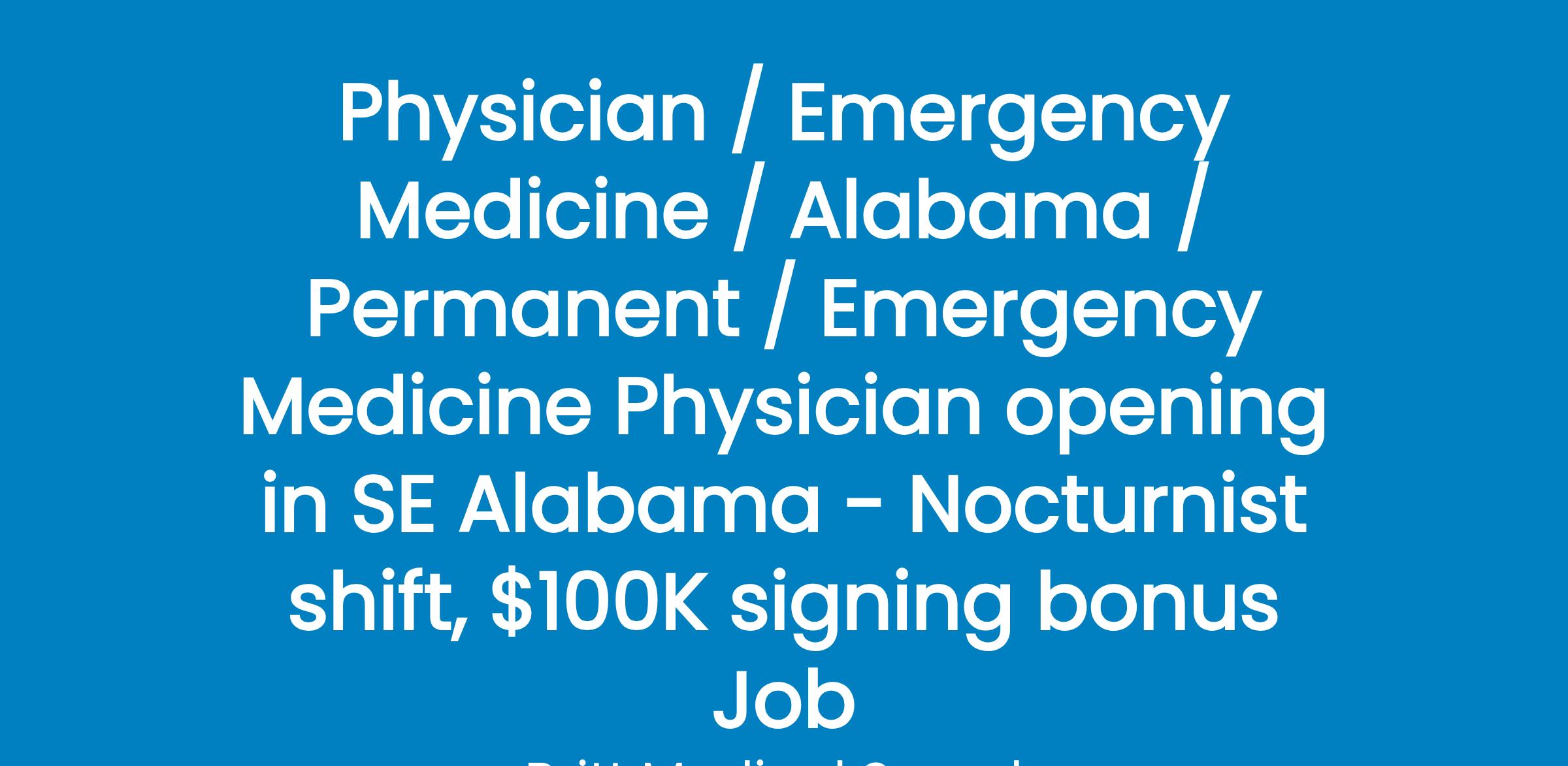 Seeking a full-time BE/BC Emergency Medicine Physician to join our team serving the emergency care needs of the region of southeast Alabama.Highlights: - Dedicated Nocturnist schedule is 5p-3a
