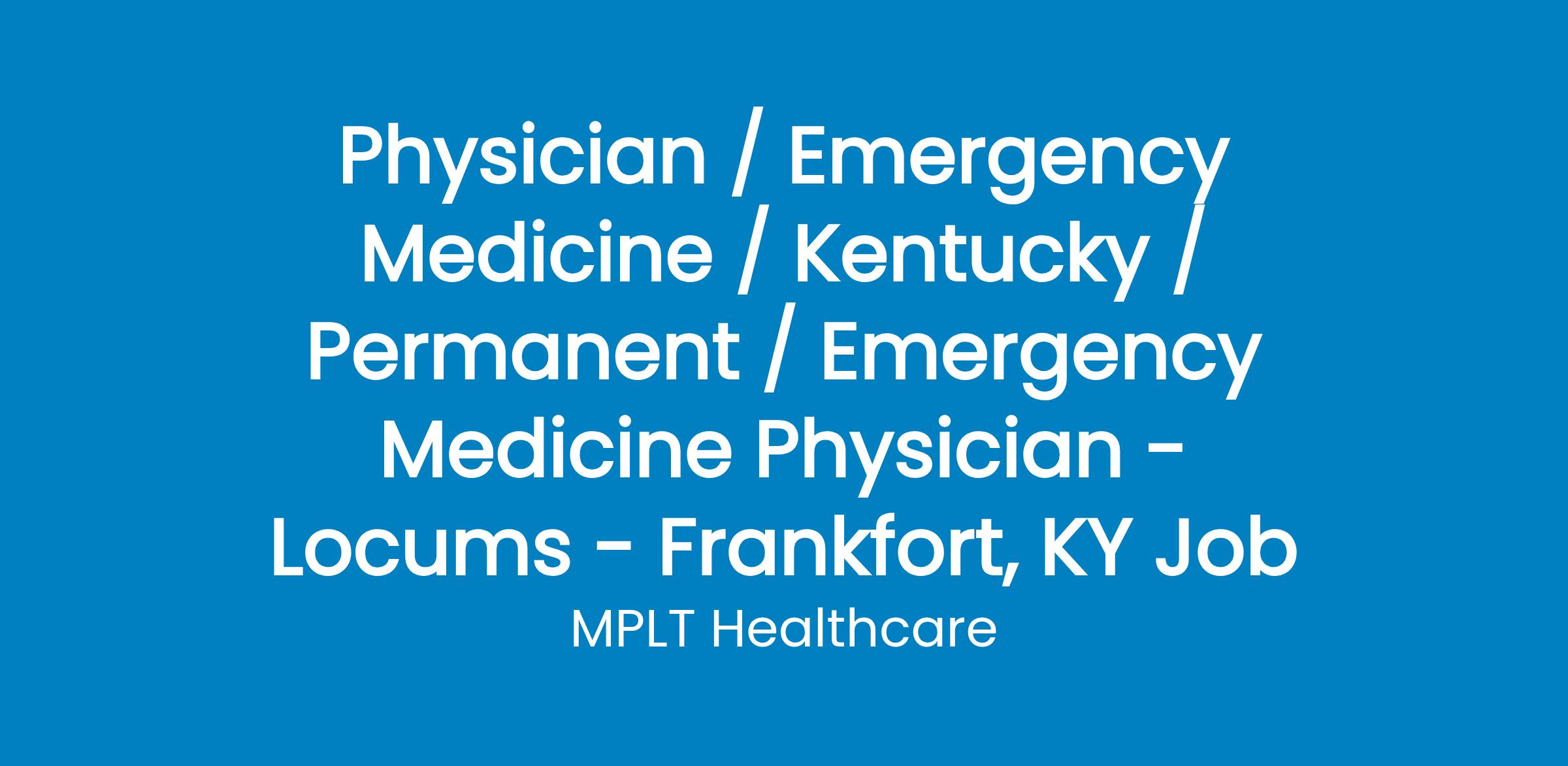 MPLT Healthcare is looking for physicians who Understand the Urgency, Never Give Up, and Have the Courage to Excel in the forever changing medical industry! We have numerous opportunities for an experienced Emergency Medicine Physician with highly competitive pay rates in Frankfort, KY.