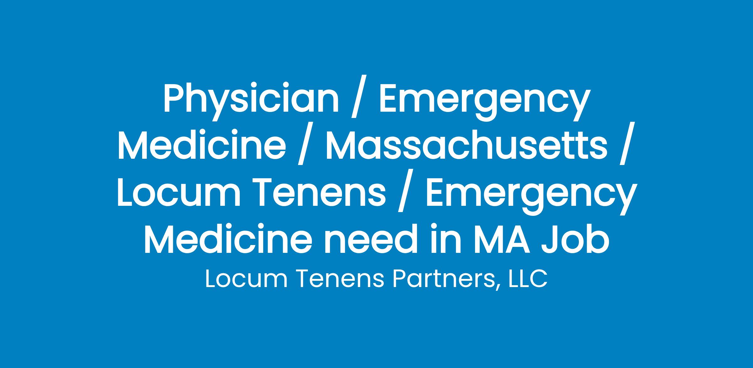 Great MA Emergency Medicine opportunity for Supplemental coverage starting 4/1/24 or ASAP and ongoing through 8/31/24. One provider needed.OutpatientSchedule: need 3-4 shifts per monthShift: 7a-4p; 3p-12a; 10a-10p; occasional over-night shifts 11p-8a44 Bed Dept.Annual ER Volume: 60,000Group: 10 ED Physicians% ED pts. transferred/day: 1-2 out of 150 pts.30% total ED volume staffed by Fast Track.Locum will be required to supervise APPs.ED will respond to house codes or airwayEMR: MediTechExpenses covered, weekly pay and Occurance Form Malpractice insurance provided.Please call, text or email for more information.Stefanie Bell