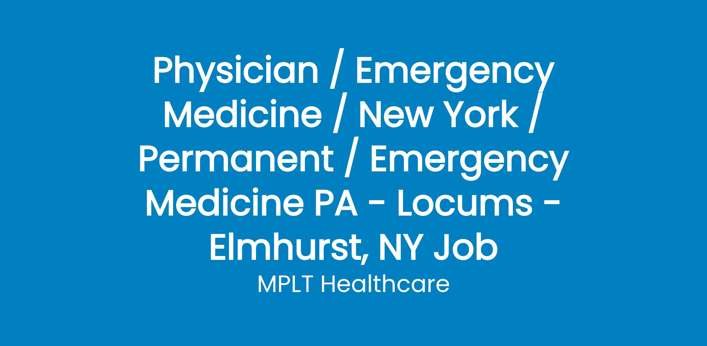 MPLT Healthcare is looking for PA s who Understand the Urgency, Never Give Up, and Have the Courage to Excel in the forever changing medical industry! We have numerous opportunities for an experienced Emergency Medicine PA with highly competitive pay rates in Elmhurst, NY.