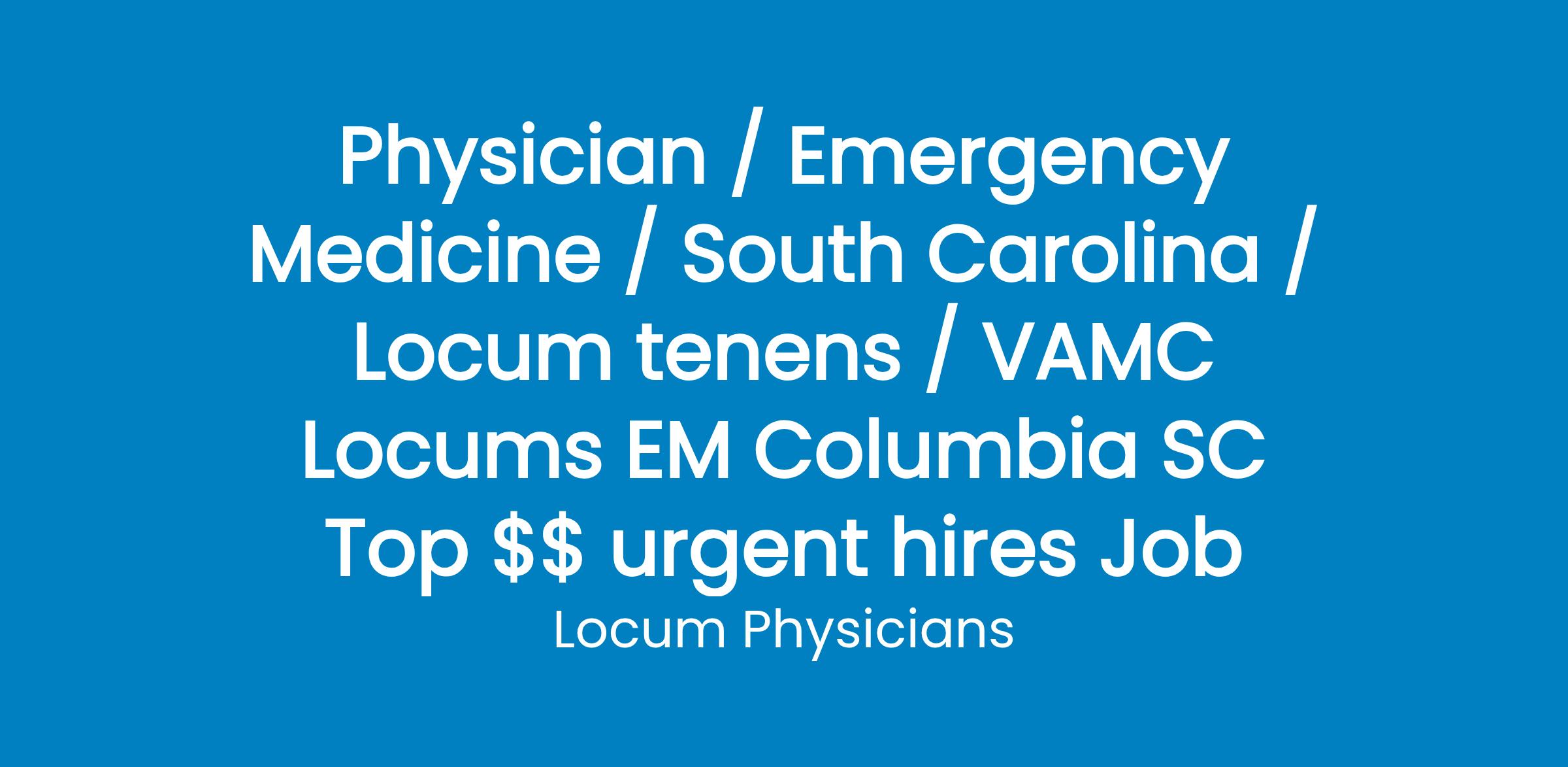 Columbia SC VAMCEM contractAny state licenseNight shifts; 12hrs8P-8A; minimum of 3 shifts per trip to SC requiredAnnual volume 33,000All Hotel, airfare, car rental and malpractice coveredNon-trauma center11 bed ER- 8 fast track bedsMust be residency trained in ER and be BC or BECurrent CV-no gapsOne US active unrestricted license Current DEA3 current references to verify clinical skills in last 12 monthsBLS/ACLSExperience with EMRPlease submit creds today:CV, license, DEA, ACLS/BLS from AHA, List of 3 current references; any malpractice settlement and/or licensure action(s) if it applies.We look forward to hearing from you!