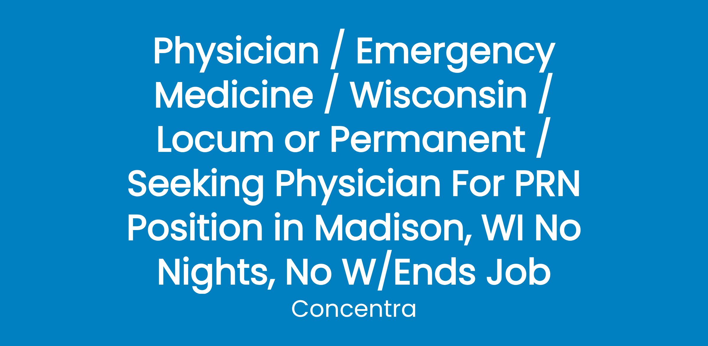 NEW Opportunity Concentra, one of the largest Occupational health care companies in the nation, is seeking a BC/BE Physician for our Madison, Wisconsin PRN opportunity at: 358 Junction Rd., Madison, WI 53717. Your patients, as well as your medical and support team, will look to you for your excellent problem solving and leadership skills. As a Concentra PRN Physician, you will be assessing patients and providing treatments while ensuring an exceptional and reassuring experience. The treatments you provide will make a tremendous difference in the lives of those who look to us for care and comfort. Shifts are M- F 8:00-5:00.At Concentra, you not only are rewarded by helping thousands of patients feel better each year but also by the recognition you receive as a leader within the company. Your ideas will be heard. In addition to patient care, every Physician has the opportunity to make an impact on procedures and policies at the Center.DETAILS & BENEFITS:Clinical environment w/minimal travelOccupational Medicine experience preferred, but we are willing to train otherwise qualified candidates in this area of medicineLicensure requirements of the state of jurisdictionGraduate of accredited MD or DO program of accredited universityUnrestricted DEA license for state of jurisdictionMust be eligible to participate in MedicareTraining Provided in Our World-Class Occupational Medicine Process Management ModelMedical Malpractice Coverage401(k) with Employer MatchEmployees with Concentra enjoy work and life equally