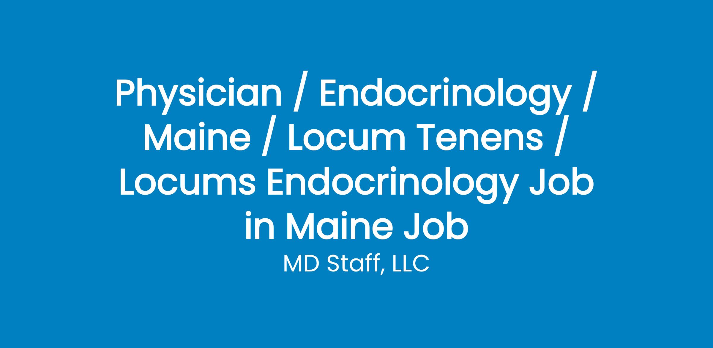 Locum Tenens Physician - Endocrinologist Needed in Maine Maine Medical Center is seeking an Endocrinologist to provide coverage at their Endocrinology Diabetes sites located near EAST WINTHROP, ME. Here are the details: Job Details: Start Date: 12/26/2023 End Date: 8/31/2024 Shift: Monday - Friday, 8a-5p, no call Setting: Inpatient/Outpatient Average Patients Per Day: 14-16 EMR: EPIC Required Treatments: Diabetes, Cushing's Disease, Graves Disease, Hyperthyroidism, Hypothyroidism, Parathyroid Carcinoma, Adrenal Cancer, Thyroid Cancer, Osteoporosis Required Procedures: FNA/Thyroid Ultrasound Credentialing Timeframe: 90-120 days Location: Near East Winthrop, ME For more details or inquiries, please contact MD Staff at or via email at . Please reference Job ID