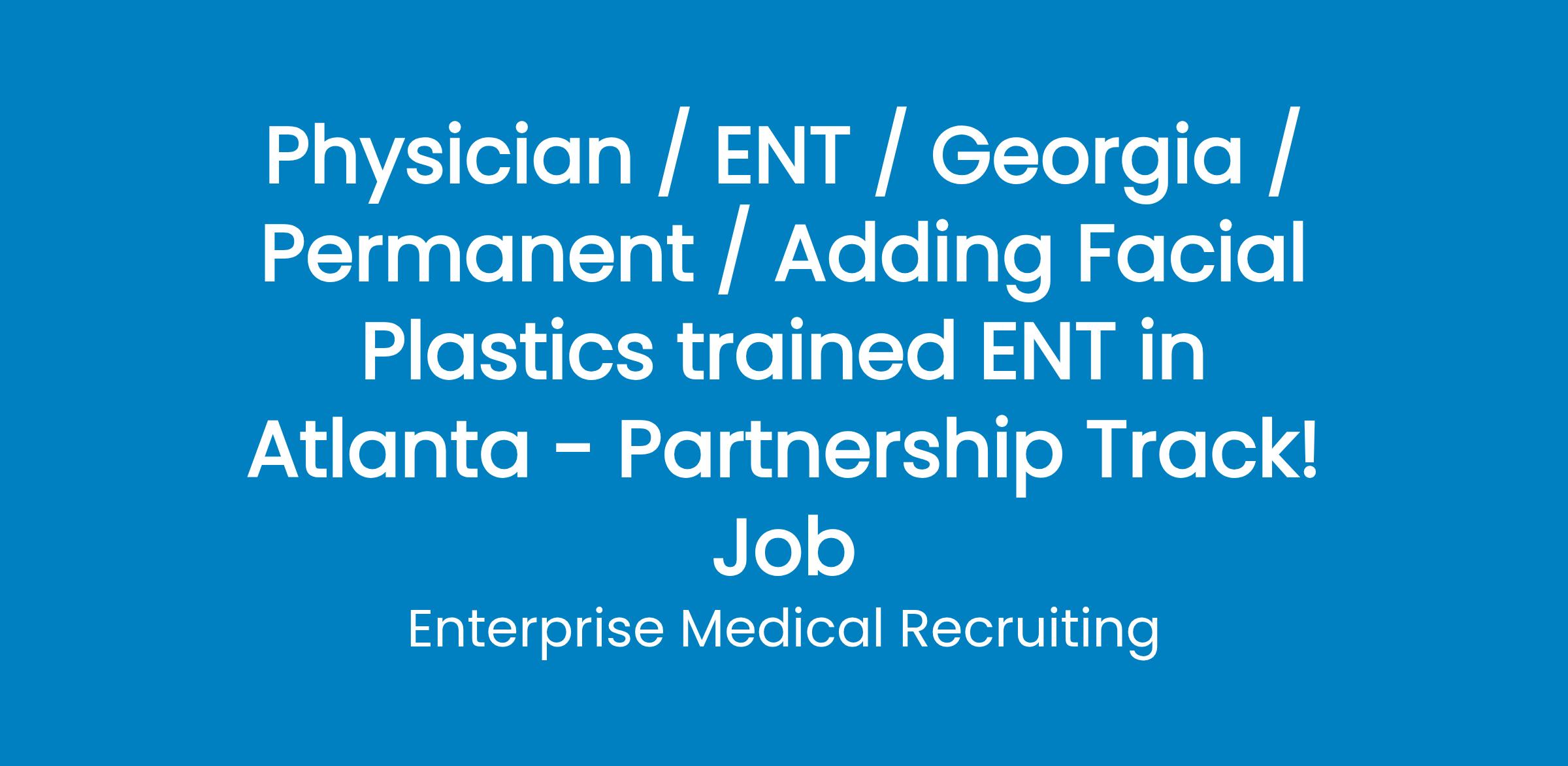 An Atlanta, Georgia ENT practice is seeking an ENT/Facial Plastics fellowship-trained physician. This is a partnership opportunity to join a 25-year established and well-respected group in the northern suburbs of Atlanta. A Collegial team of physicians with an excellent practice environment.