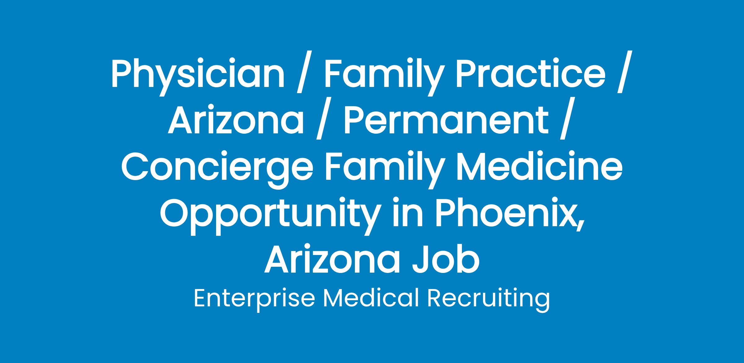 Enterprise Medical is assisting a unique primary care group that delivers the highest-quality care and services in their search for Outpatient Family Medicine physicians to work in their primary care clinic in Phoenix, Arizona. The position will serve patients of all ages.