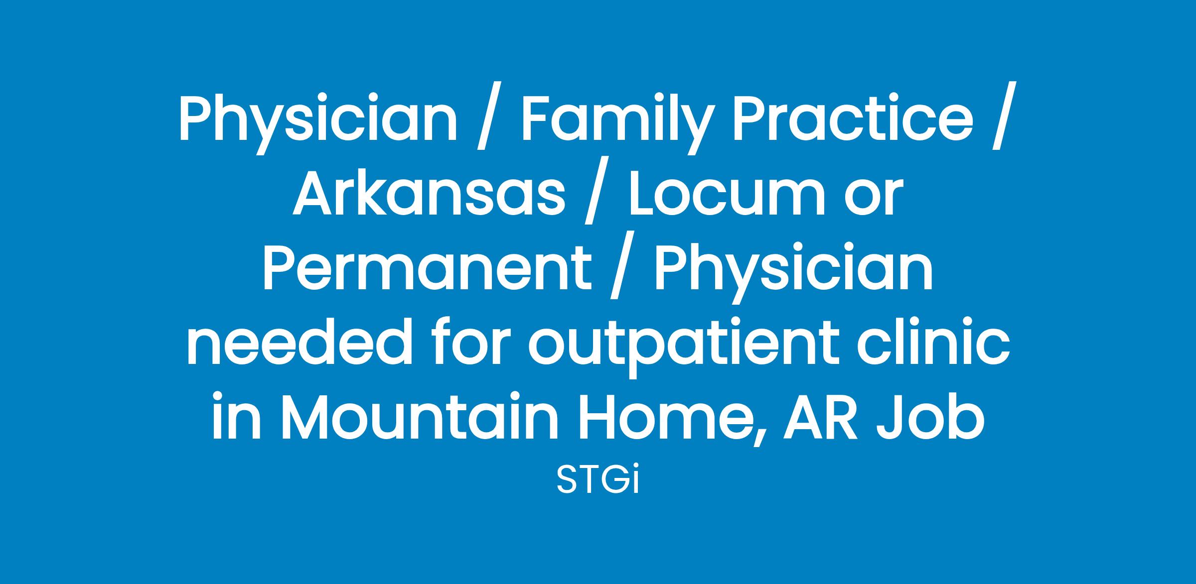 STG International is currently looking for a Family or Internal Medicine physician to provide support and primary care to military Veteran patients at our Community Based Outpatient Clinic(CBOC) in Mountain Home, AR. As a physician at one of our Community Based Outpatient Clinics, you would create a welcoming experience for our military Veterans that have served our country. Provide medical care based on primary and preventative care to meet the needs of the patient. Enjoy regular hours with no weekends, and no after hours call. Requirements Include: Possess a Doctor of Medicine or Doctor of Osteopathic Medicine from an accredited school in US or internationally. Candidates must have successfully completed a residency program in Family Practice or Internal Medicine with recognition by the American Board of Medical Specialties or the American Osteopathic Association. Current and unrestricted DEA and Arkansas medical license. Retain current Cardiopulmonary Resuscitation (CPR)/ Basic Life Support (BLS) from the American Heart Association (AHA) or the Military Training Network (MTN). Minimum of one year experience as a licensed physician. STG International offers a competitive salary and benefits package which includes Medical, Dental, Vision, 401k with company match ,PTO, CME and more. ? If you are interested in learning more about this and other opportunities, please email or call ext. 366.