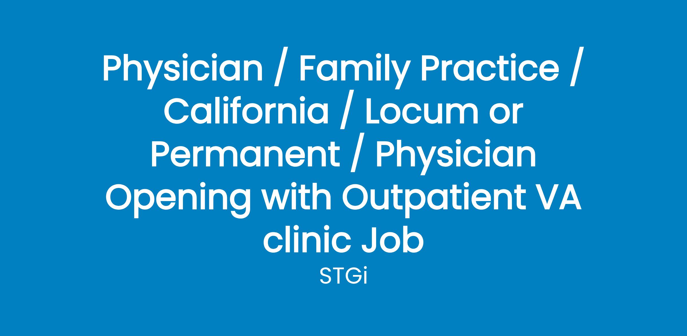 STG International is currently looking for an Internal Medicine or Family Medicine physician to provide support and primary care to military Veteran patients at our Community Based Outpatient Clinic (CBOC) in Oxnard, CA. As a physician or Medical Director at one of our Community Based Outpatient Clinics, you would create a welcoming experience for our military Veterans that have served our country. Provide medical care based on primary and preventative care to meet the needs of the patient. Enjoy regular hours with no weekends, and no after hours call. Located in Ventura County. We have a similar opening in Lancaster, CA Requirements Include: Possess a Doctor of Medicine or Doctor of Osteopathic Medicine from an accredited school in US or internationally.Candidates must have successfully completed a residency program in Family Practice or Internal Medicine with recognition by the American Board of Medical Specialties or the American Osteopathic Association. Current and unrestricted DEA.Retain current Cardiopulmonary Resuscitation (CPR)/ Basic Life Support (BLS) from the American Heart Association (AHA) or the Military Training Network (MTN).Knowledge of and ability to apply professional medical principles, procedures, and techniques in accordance with the community and VA standards of practice.Oversee all day-to-day delivery of medical care to patients.Minimum of one year experience as a licensed physician. STG International offers a very competitive benefits package which includes Medical, Dental, Vision, 401k with company match, PTO, CME and more. If you are interested in learning more about this and other opportunities, please email or call ext. 366. You can also visit our website at to review careers with us.