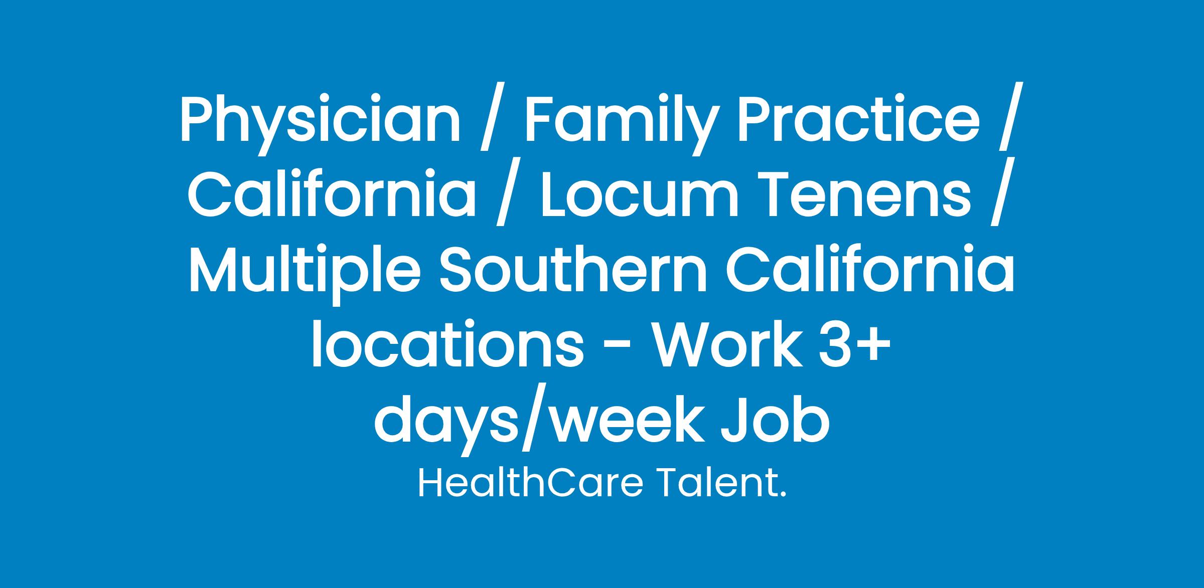 Locum TenensPrimary Care Providers Needed 8-Hour ShiftsWork 30-40 hours/week based on your availability1099Outpatient Primary Care / Never be on callDedicated and knowledgeable support staffLocations with openings now through March/April 2020 with options to extendMust be BC/BE and CA licensedPositions are open across Southern California!