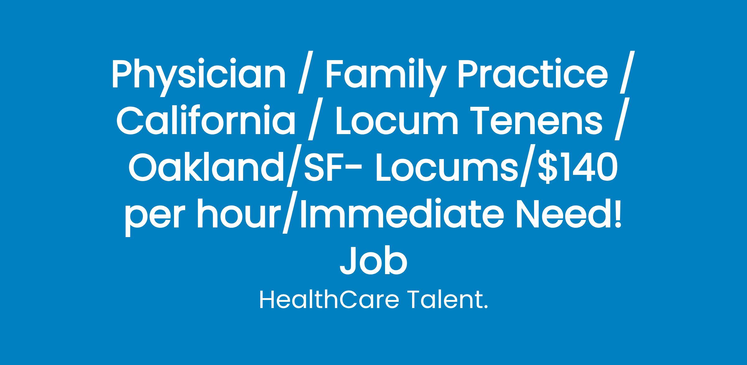 We have an immediate need for a locums provider in Oakland and one day in SF. Join mission-driven health care organization with multiple locations in the Bay Area. System provides medical, dental, therapy, HIV/HCV counseling and many other services to an underserved population. Primary Care Up to $140/hr depending on experience Full time: 32-40 hours per week 18-20 patients daily Full spectrum of ages seen Ability to see prenatal visits if desired EPIC EMR