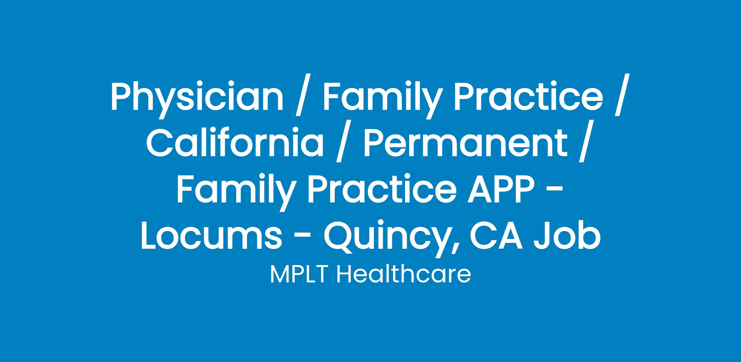 MPLT Healthcare is looking for APP s who Understand the Urgency, Never Give Up, and Have the Courage to Excel in the forever changing medical industry! We have numerous opportunities for an experienced Family Practice APP with highly competitive pay rates in Quincy, CA.