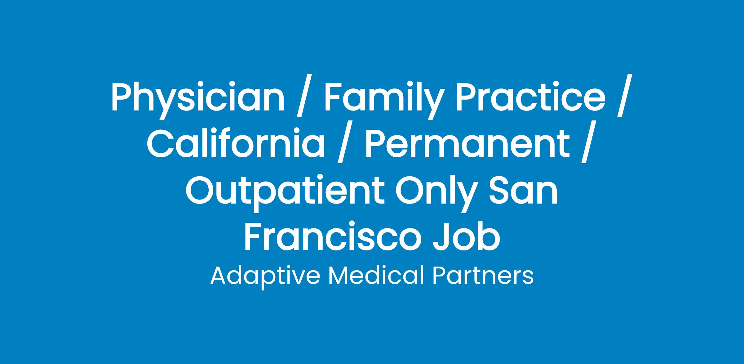 Outpatient Only San FranciscoQuality of life schedule ideal for Work/Life balanceMonday-Friday with no weekend or hospital workEstablished practice And Growing!Competitive salary with comprehensive benefits to include relocation and CMEWell respected clinic with great leadershipTenured and supportive Mid-Level and RN staff 44 days of paid time offA world-class city in every respect. San Francisco has a lot going for it: exceptional arts and cultural activities, plenty of history, a strong commercial and financial core; and all the education and services anyone could want. The many world-famous tourist attractions - Golden Gate Bridge, Fishermans Wharf, cable cars, Chinatown, and the wine country to the north. Considerable local entertainment and culture make the Bay Area one of the most interesting and fun places to live in the country. Want to learn more? Please contact Adaptive Medical Partners at and reference job .
