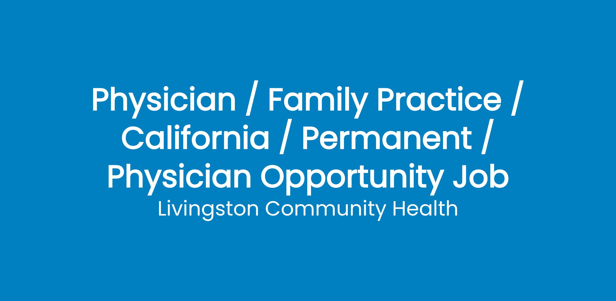 Livingston Community Health, a Federally Qualified Health Center, is seeking to employ a full time Physician to work in a community based healthcare center. We strongly recruit for those providers with the passion to serve the underserved. Located in the heart of Central California we are an hour and a half to San Francisco and to the Gateway of Yosemite National Park. We are Patient Centered, fully utilizing electronic health records and have a patient base of approximately 14,000 patients. Responsibilities include: comprehensive medical services for children and adults and disease prevention in partnership with the patient. The physician will diagnose patient conditions using examination and tests. Based on their findings, they prescribe treatment and medications to attempt to heal any illnesses or injuries.