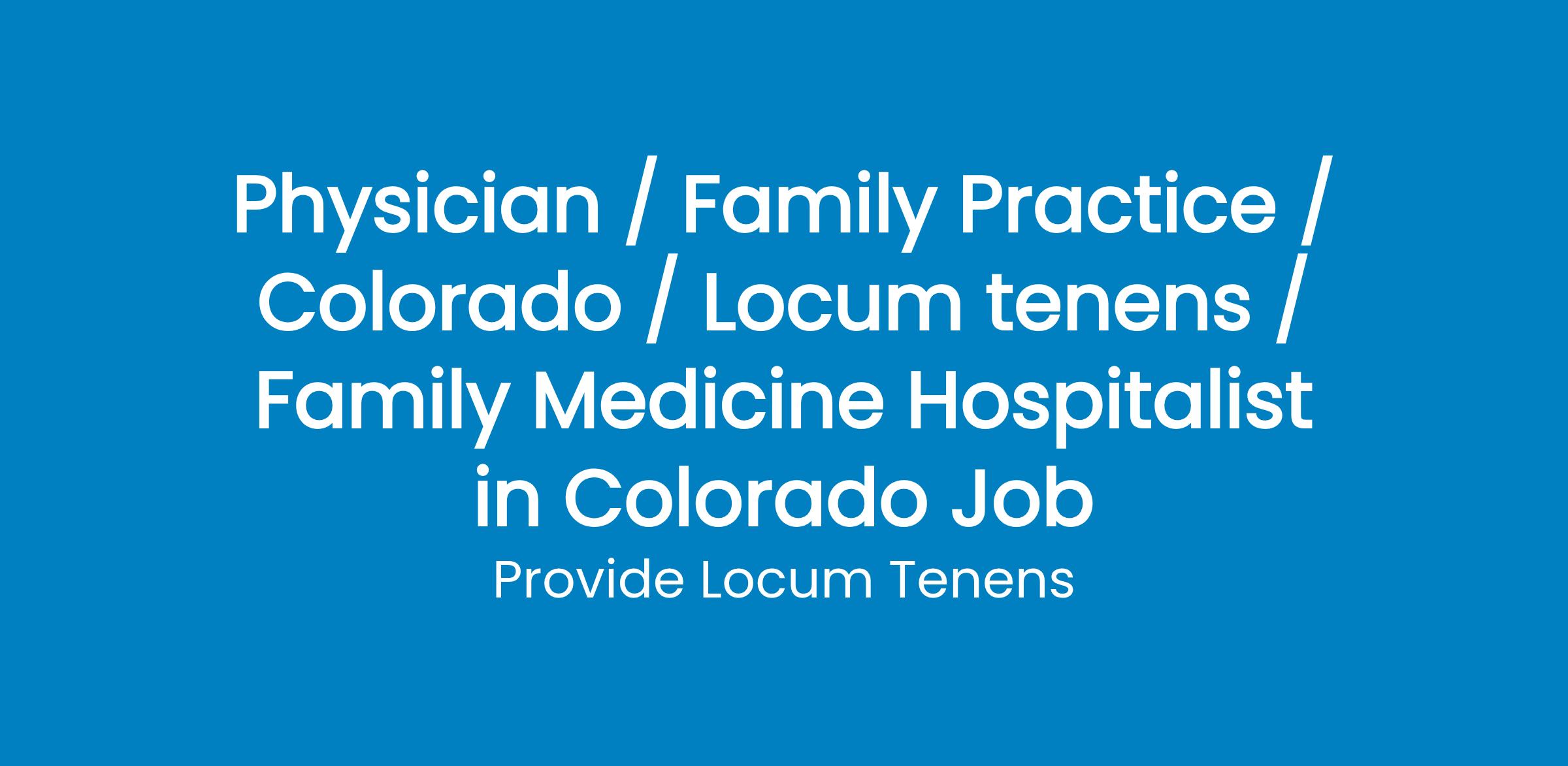 A ProvideLT client in Colorado is currently seeking a Board Certified Hospitalist to provide locums coverage ASAP. Assignment schedule is 24 hour shifts from Dec 26th at 12pm through Dec 29th at 12pm. All hospital calls. All inpatient. Average patient seen per day shift is up to 8 with 2 admits/DC daily and ICU avail(3). The Provider must be BC in Internal Medicine or Family Medicine with Hospitalist experience and background. Must be proficient also in Stress Tests and PFT's. With full hospital support. Must have an active CO license and DEA and BLS. Excellent location and great pay! .For more inquiries regarding this position call ProvideLT at Provide Locum Tenens is a physician-focused healthcare staffing firm that boasts over 30 years of experience in the healthcare industry and an A-Team of seasoned recruiters and client representatives with a relentless focus in finding the perfect opportunity for each provider and the perfect provider for each client.ProvideLT is one of the fastest growing Locum Tenens staffing firms in the industry with an increasingly large client network nationwide and opportunities in all 50 states catering to providers in over 70 specialties.Visit for more information.